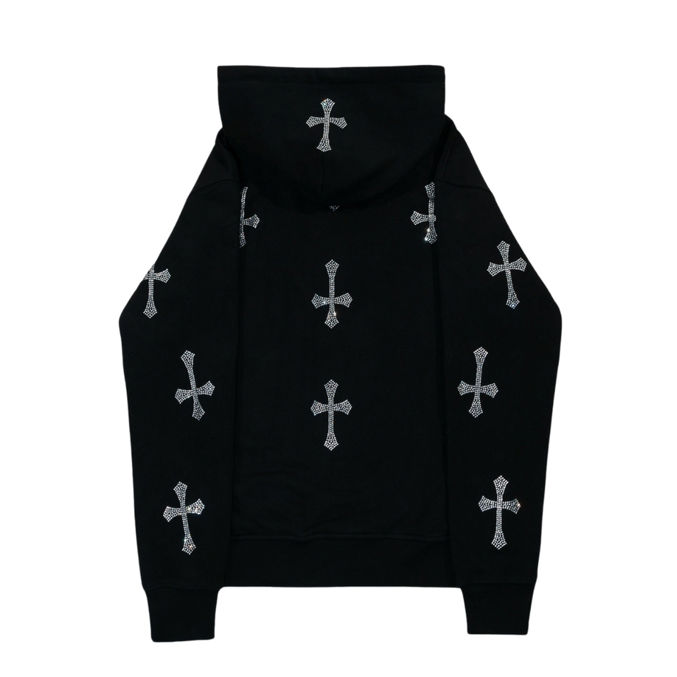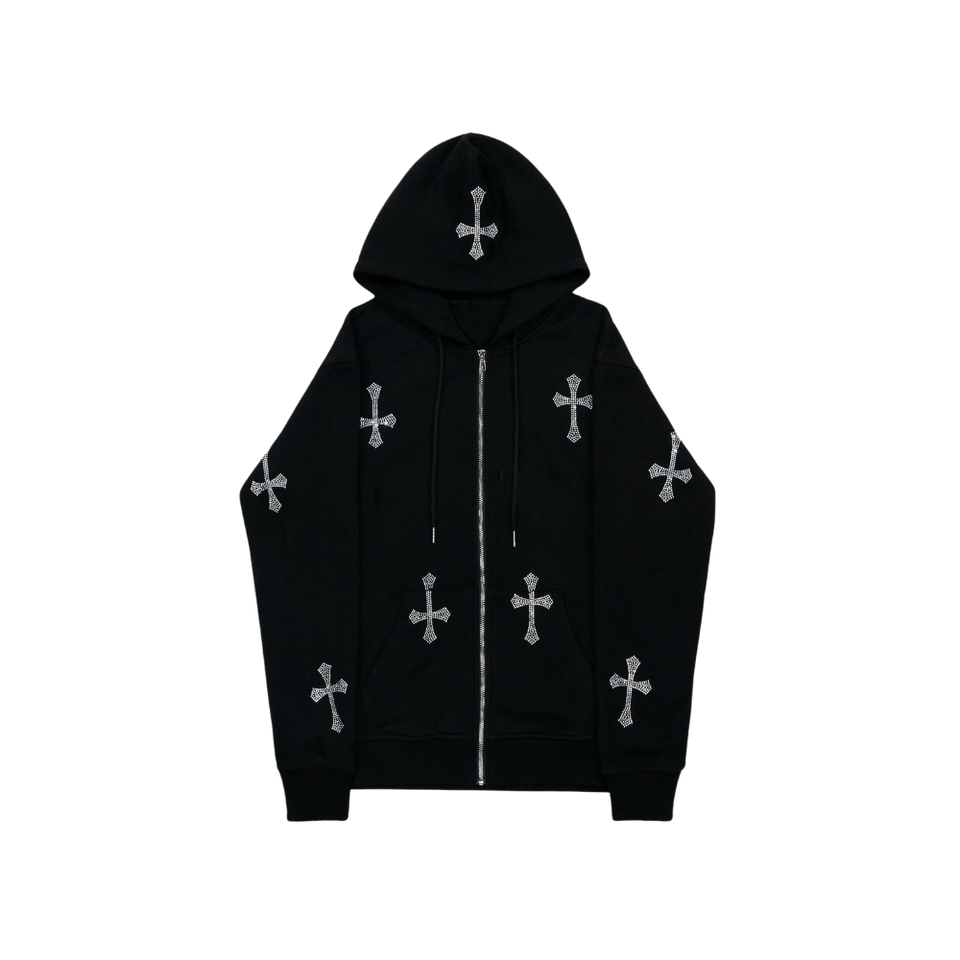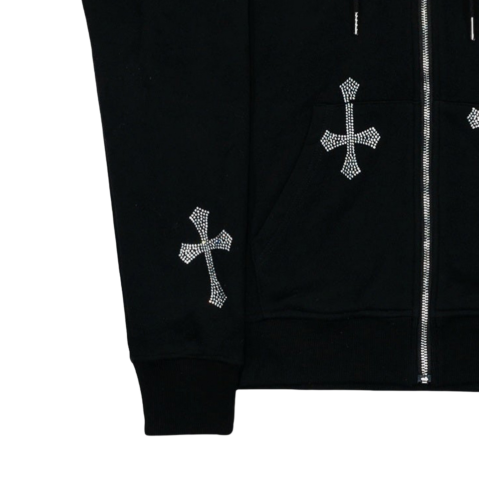 Sudadera con capucha y cremallera personalizada con cruz de diamantes de imitación – Sudadera negra estilo streetwear con diseño de cruz de cristal, chaqueta de lujo estilo hip hop, unisex, logotipo OEM