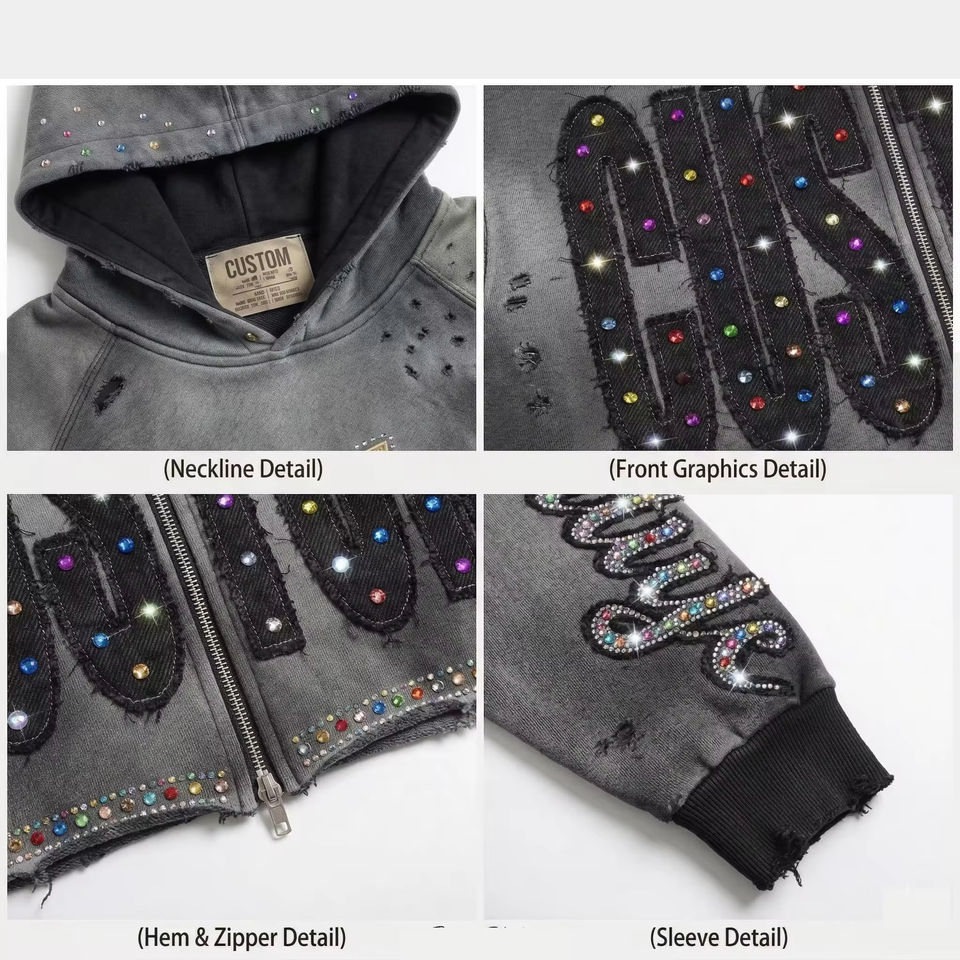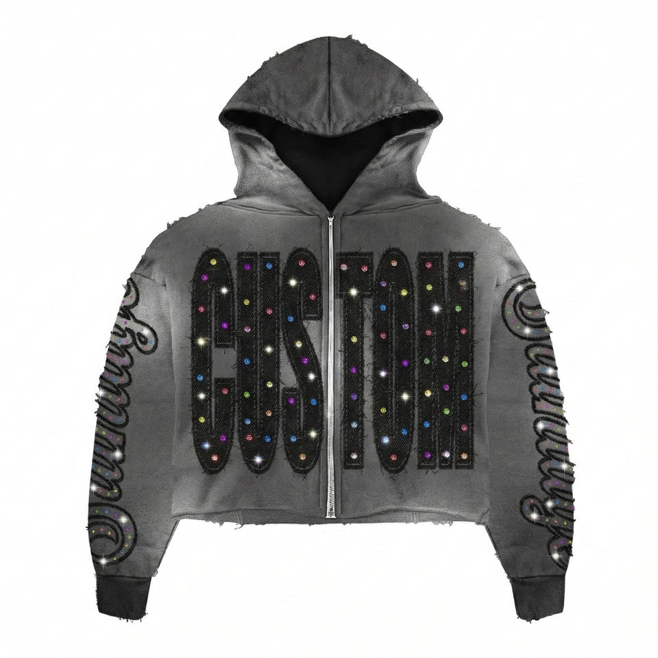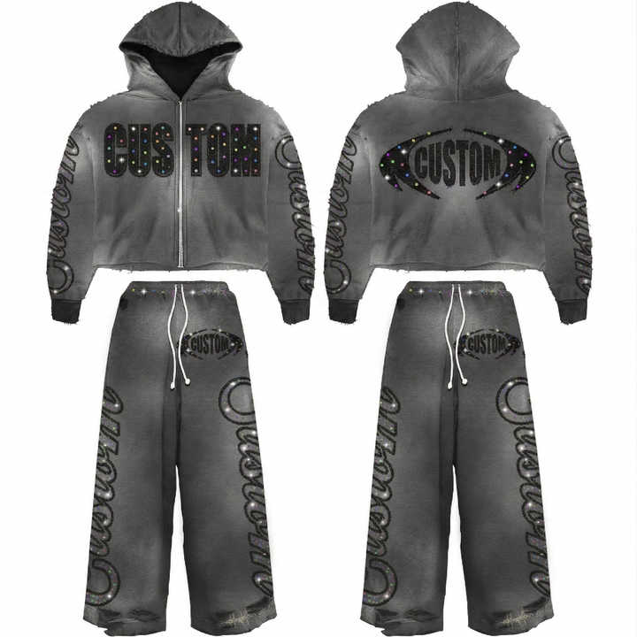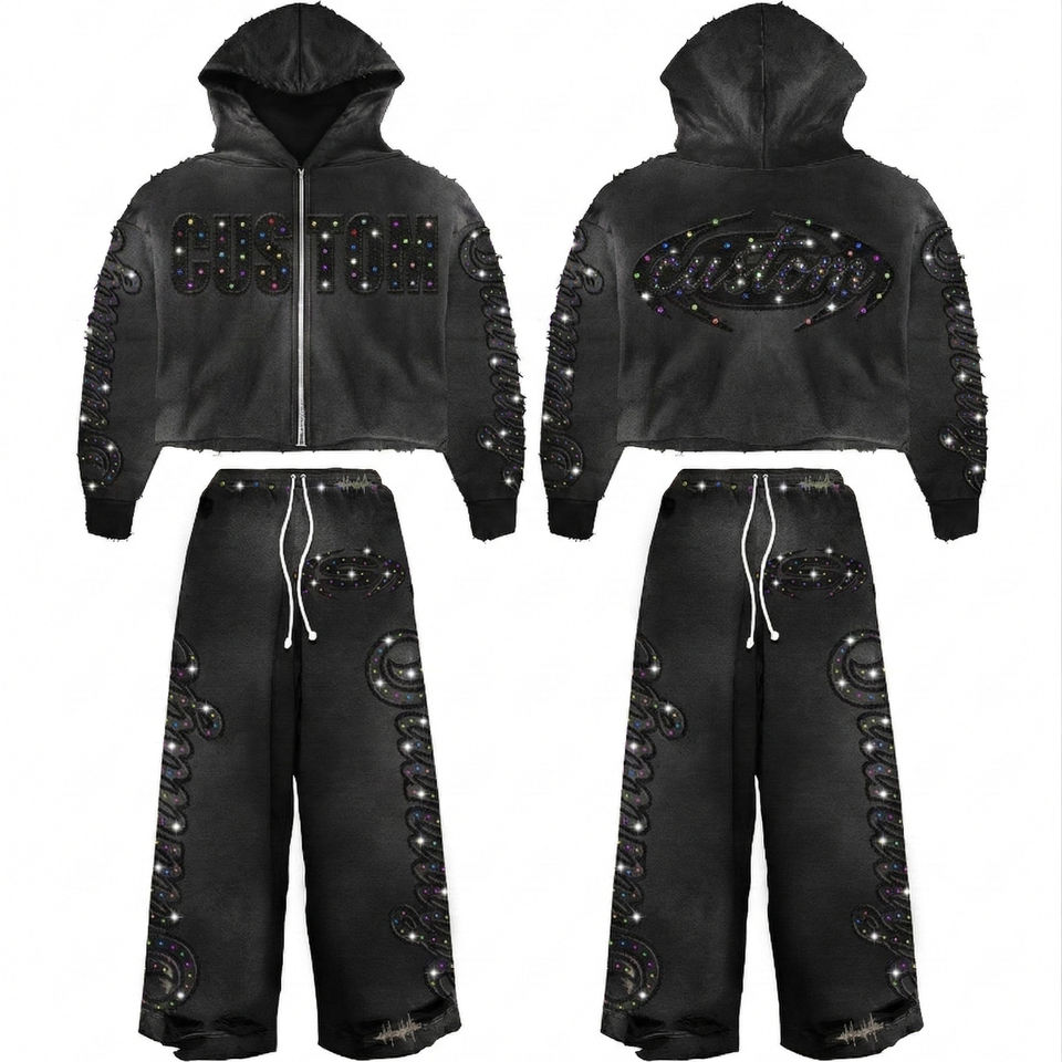 Chándal con Parche Bordado de Pedrería Personalizado | Estilo streetwear con estampado efecto desgastado por el sol | Conjunto Unisex de Moda