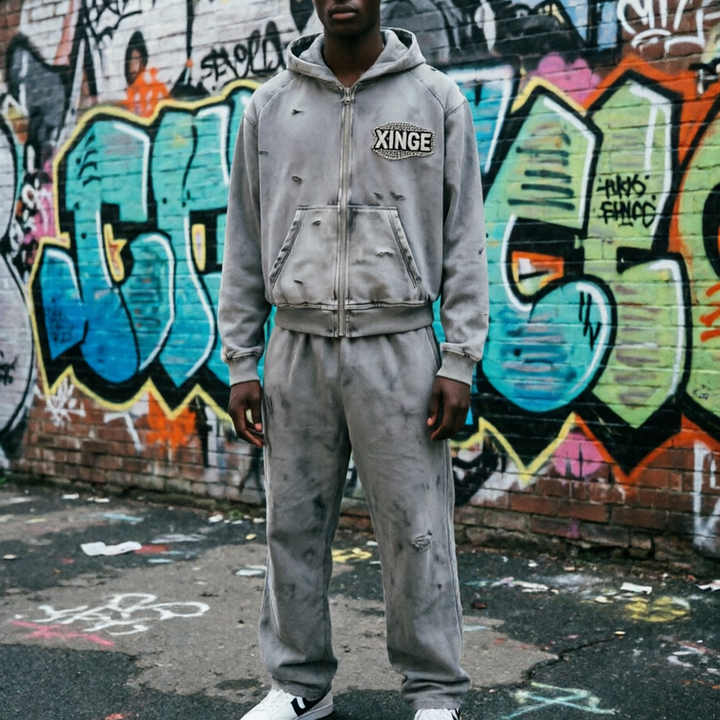 Conjunto de Sudadera con Capucha y Pantalones Deportivos Personalizados con Logotipo de Diamantes de Imitación, Estilo Desgastado, para Hombre