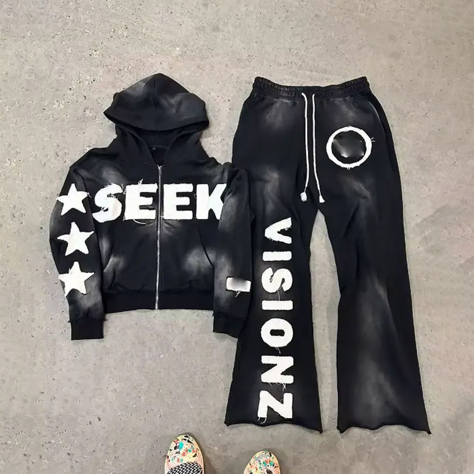 Conjunto de Chándal Personalizado con Pedrería, Sudadera Oversize y Pantalones Acampanados, Estampado Desgastado, Estilo Urbano, 2 Piezas
