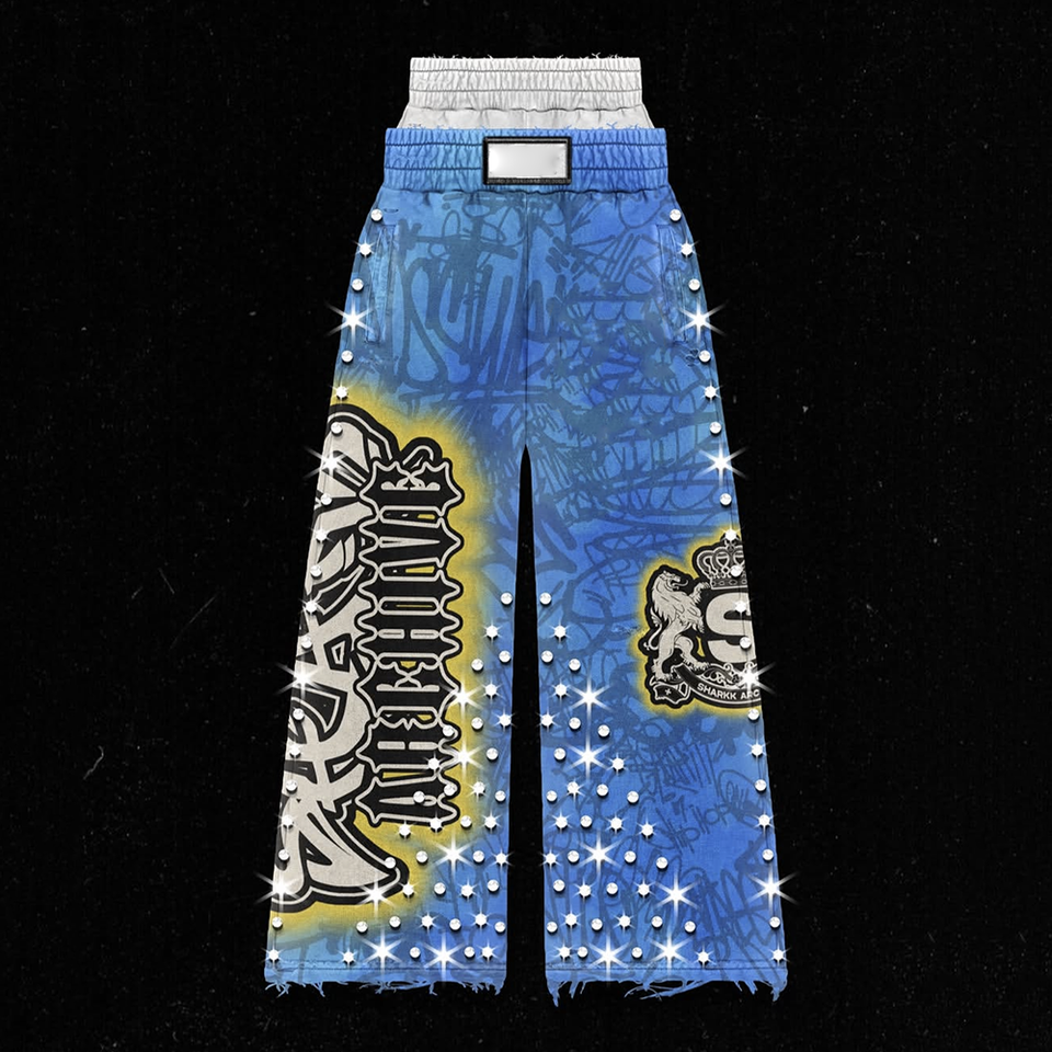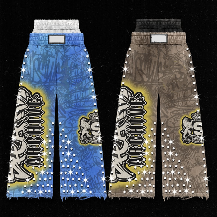 Pantalones de chándal anchos y holgados de algodón 100% de alto gramaje con lavado ácido, doble cintura y pedrería, personalizados con remaches y pedrería