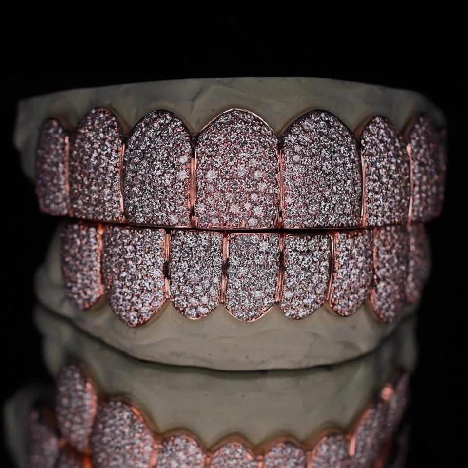 Rejilla Dental Personalizada de Oro Rosa con Diamantes Incrustados para Dientes Superiores e Inferiores, Piedras Simuladas VVS1, Joyería Hip Hop para la Boca