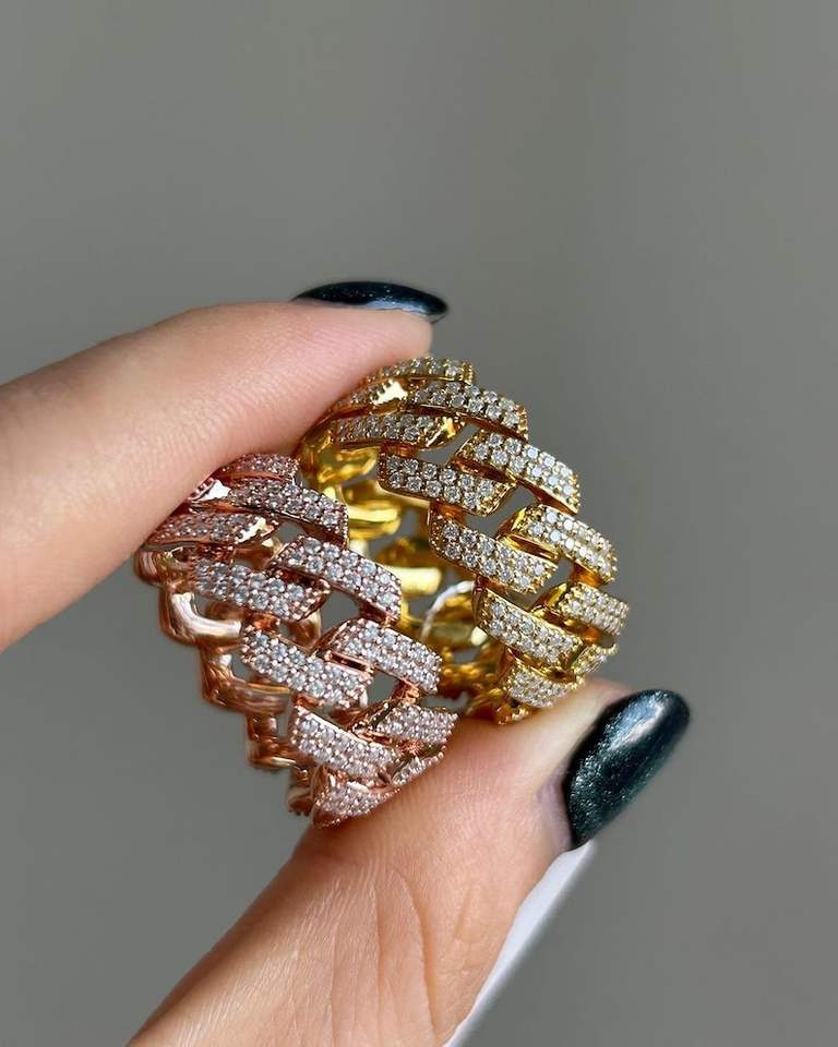 Anillo de cadena cubana de eternidad completa con diamante de talla redonda