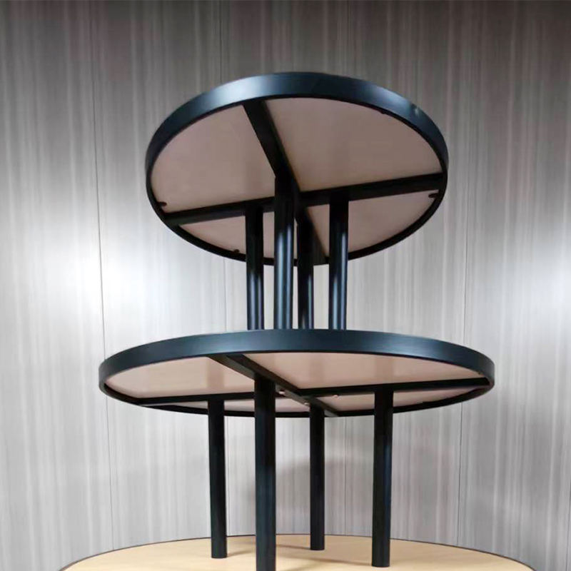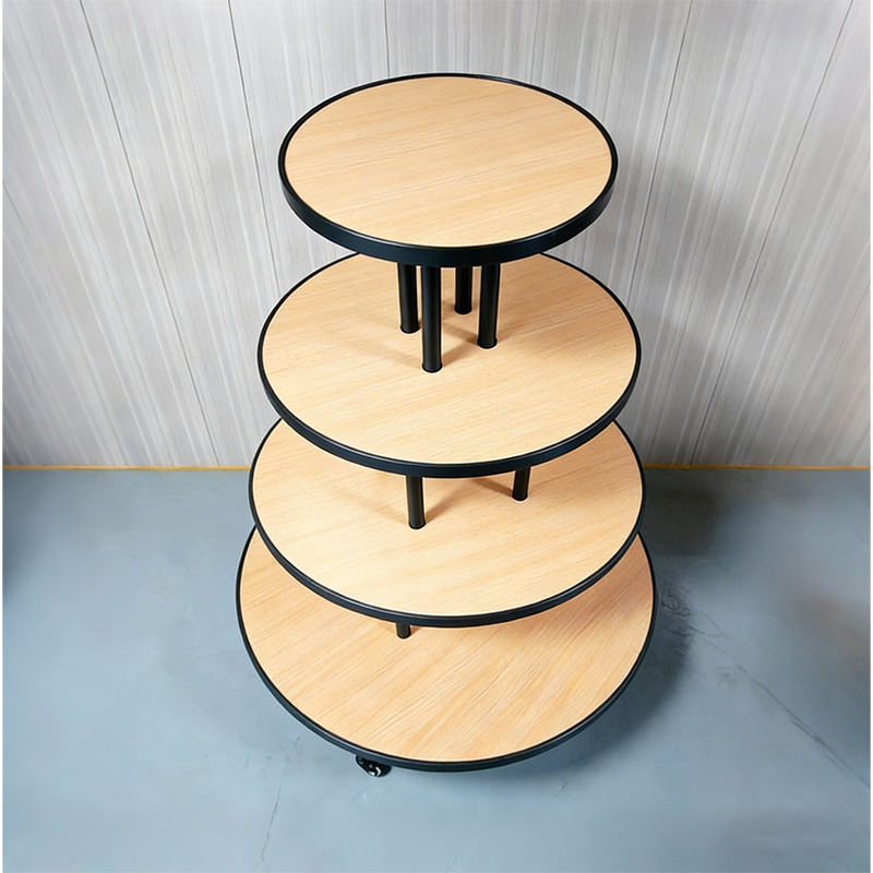 Exhibidor Redondo Rodante Personalizado de 4 Niveles con Marco Metálico y Estantes de Madera, Mueble Móvil para Ropa, Zapatos y Bolsos