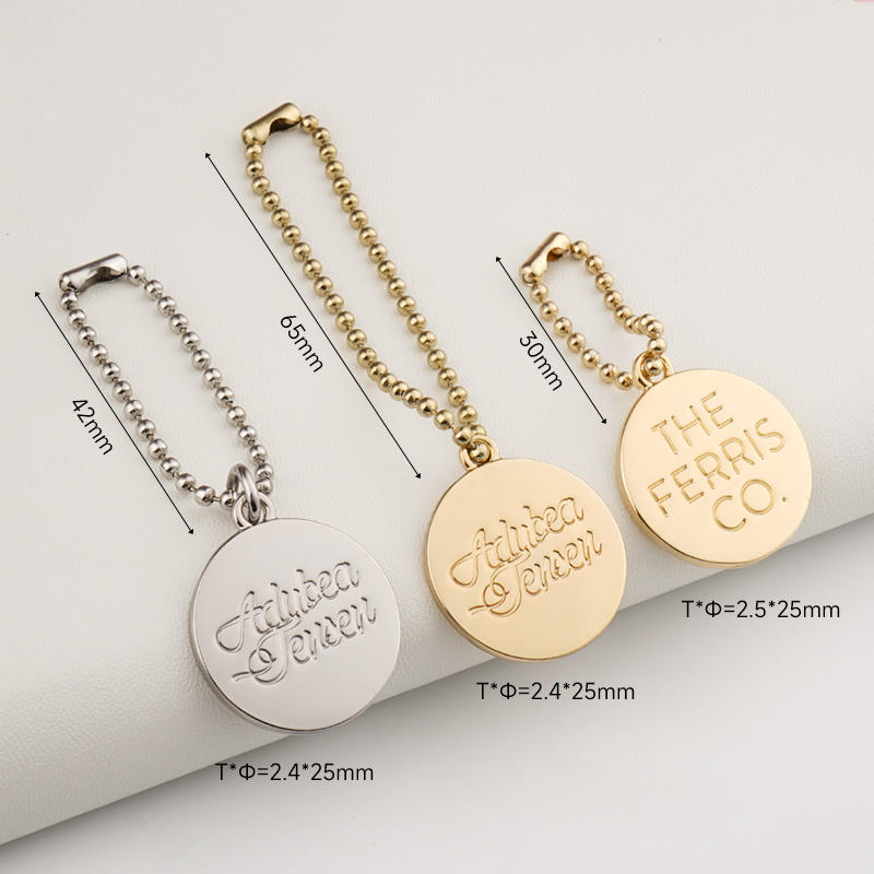 Etiqueta de metal hueco con logotipo de Torre Effiel de forma redonda personalizada con gancho de resorte y cadena para bolsos