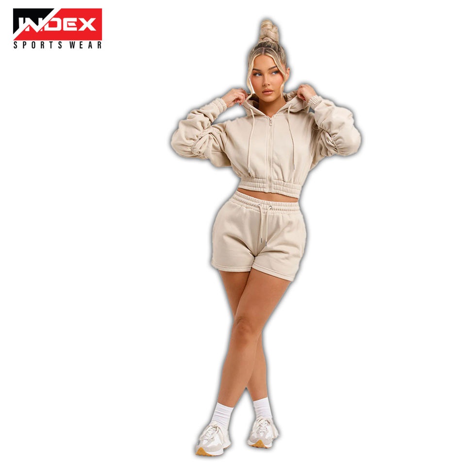 Pantalones cortos personalizados chándal conjunto de dos piezas de algodón con cremallera lavado ácido sudor traje en blanco Vintage desgastado Crop Hoodies mujeres chándales