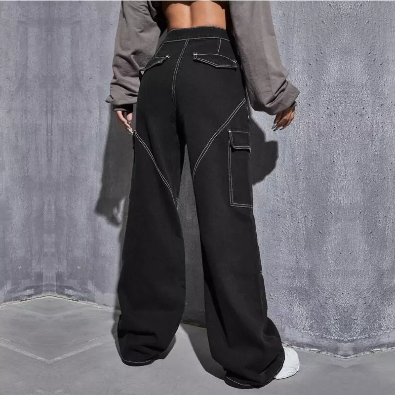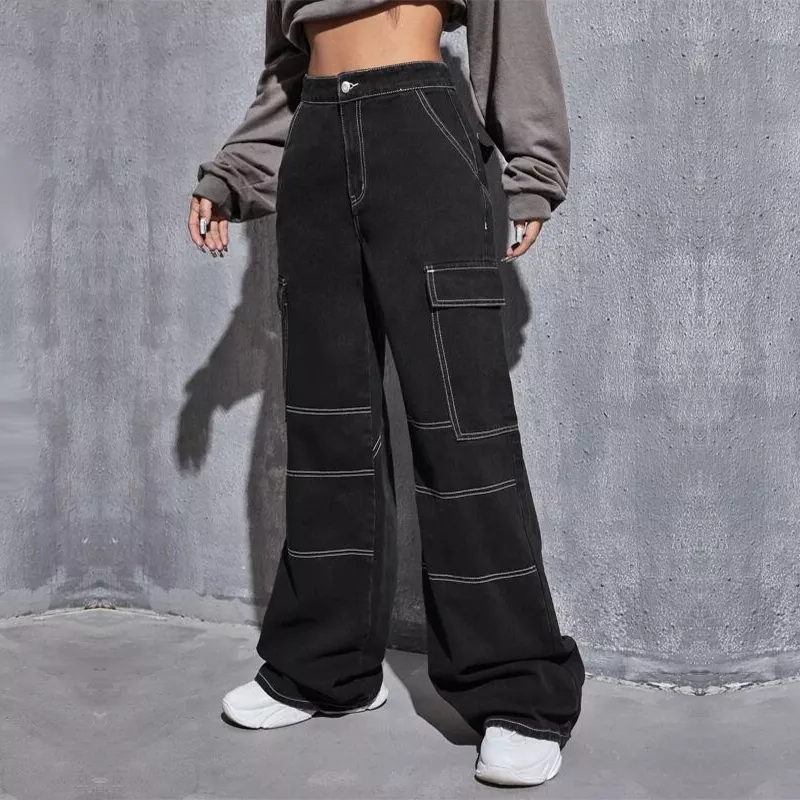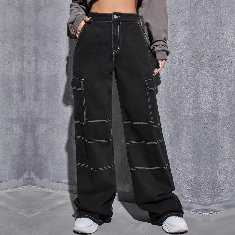 Mallas rectas personalizadas con bolsillos laterales para mujer, pantalones vaqueros con cremallera, color negro
