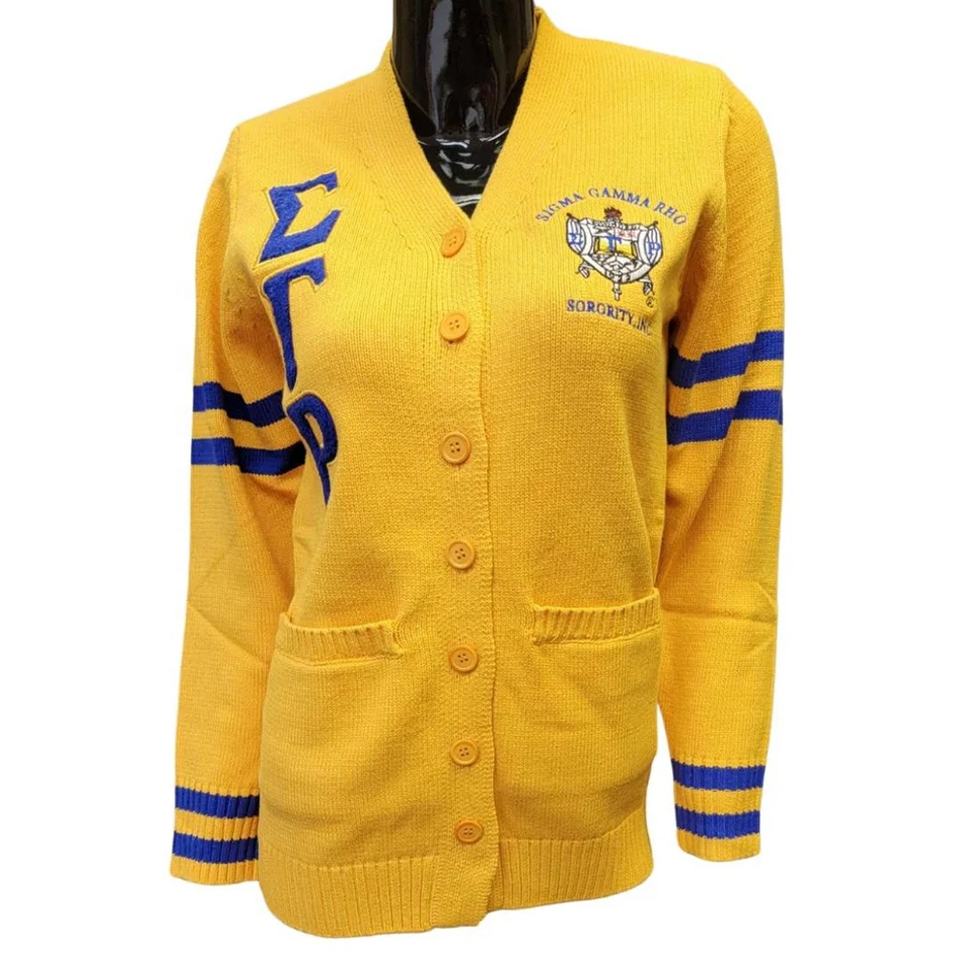 Custom Sigma Gamma Rho College Logotipos Button-Up Letterman Loose Fit Varsity Cardigan Suéter para Cheer Team Knitwear Cardigan