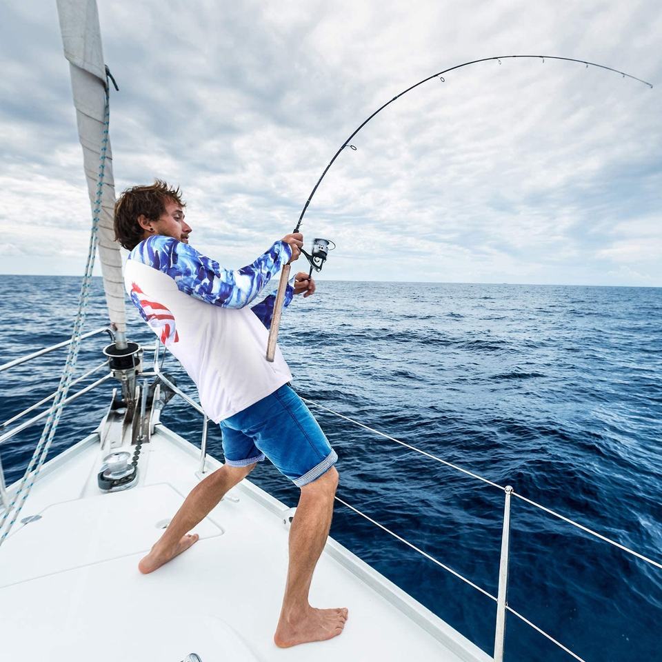 Camisas de Pesca de Marlin de Manga Larga Azul Claro con Diseño Personalizado Serigrafiado, Nueva Llegada, 240g, Antibacterianas y con Protección UV para Hombre