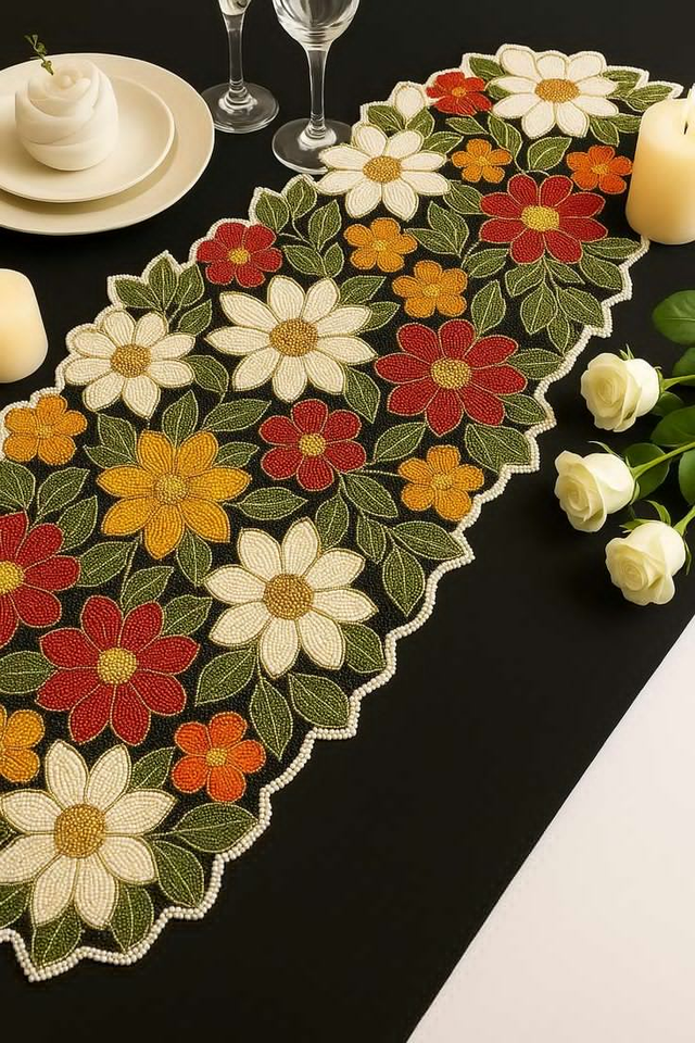 Camino de mesa bordado con cuentas de tamaño personalizado para decoración del hogar, camino de mesa con cuentas de vidrio y diseños de bordado tradicionales.