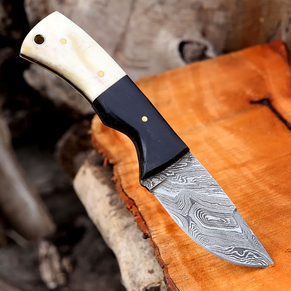 Cuchillo de Caza de Hoja Fija con Borde Dentado de Acero Inoxidable Damasco Hecho a Mano, Tamaño Personalizado, Funda de Cuero, OEM Personalizado