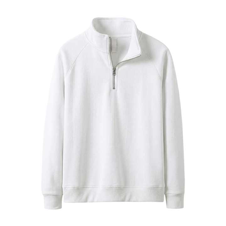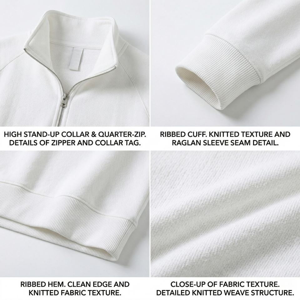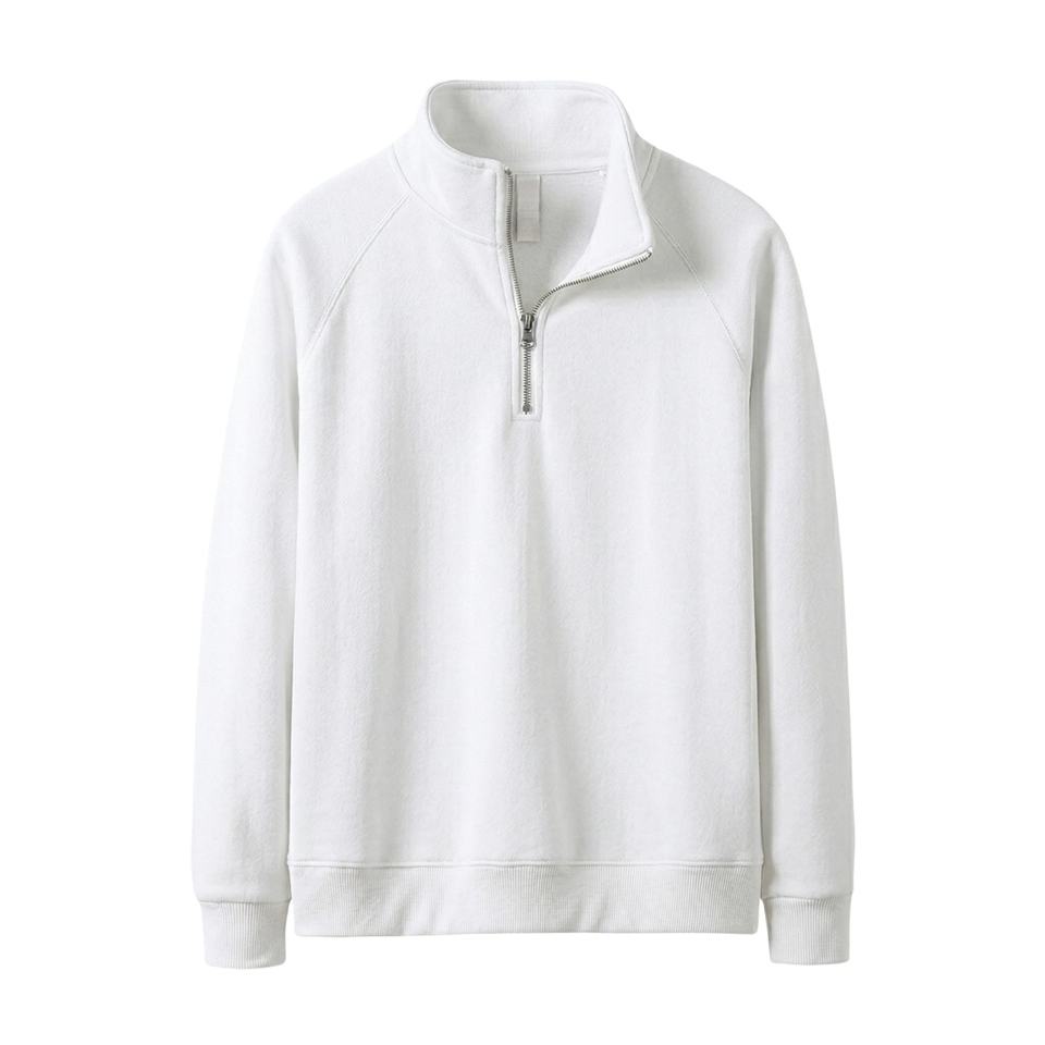 Sudaderas personalizadas de color blanco sólido con media cremallera TKAN1102D de alta calidad con mangas raglán, estilo deportivo y urbano para hombre.