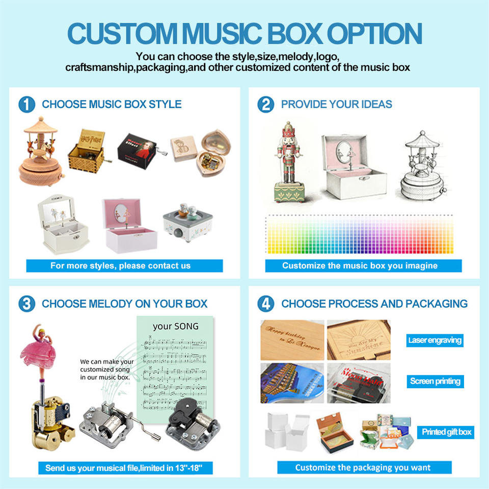 Canción personalizable: Permite melodías personalizadas, haciendo que la caja de música sea única y adaptada a necesidades o preferencias específicas.