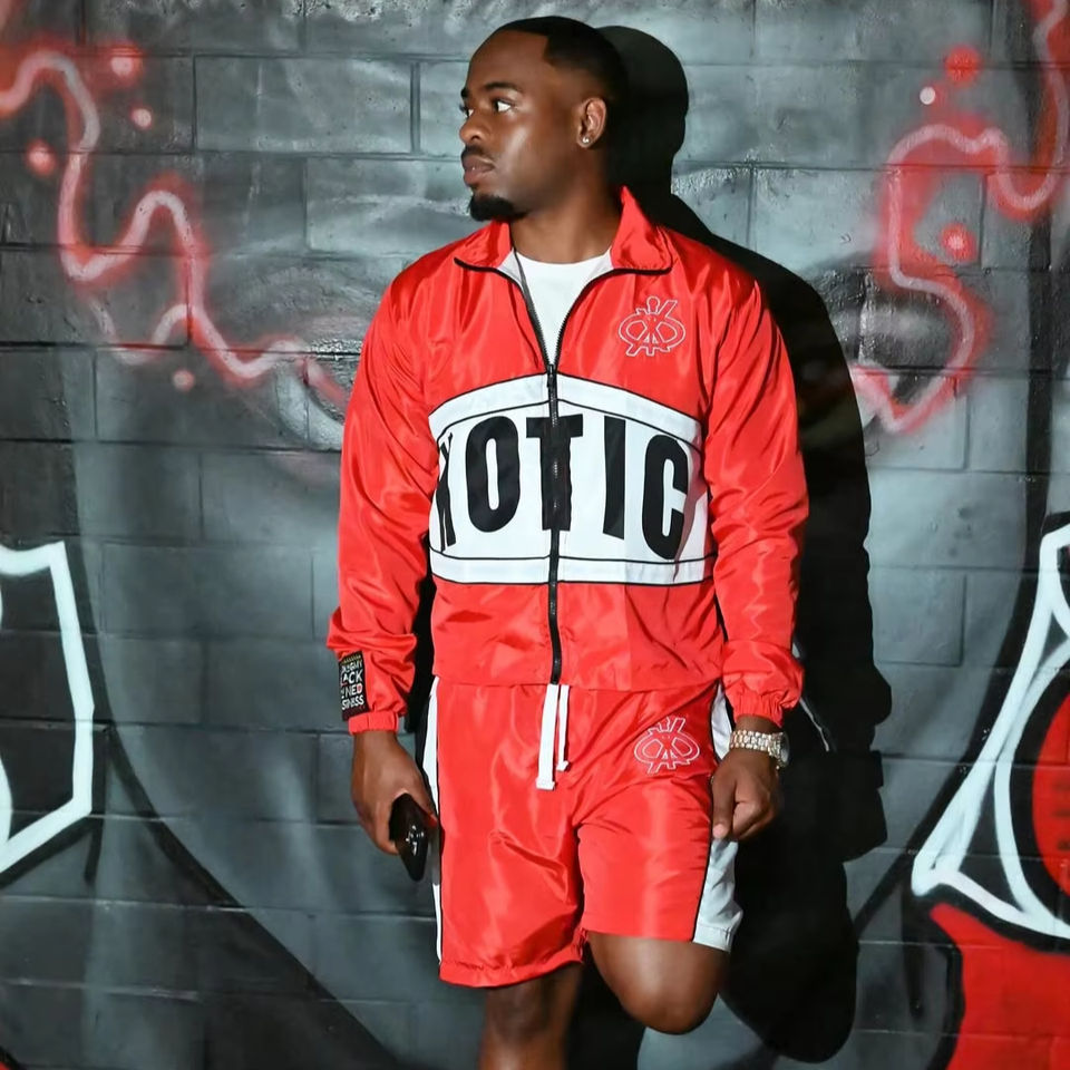 Ropa deportiva personalizada Diseño de rayas impermeables Cortavientos de poliéster de nailon rosa y pantalones cortos Chándal holgado para hombres