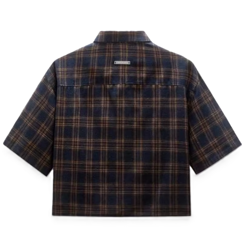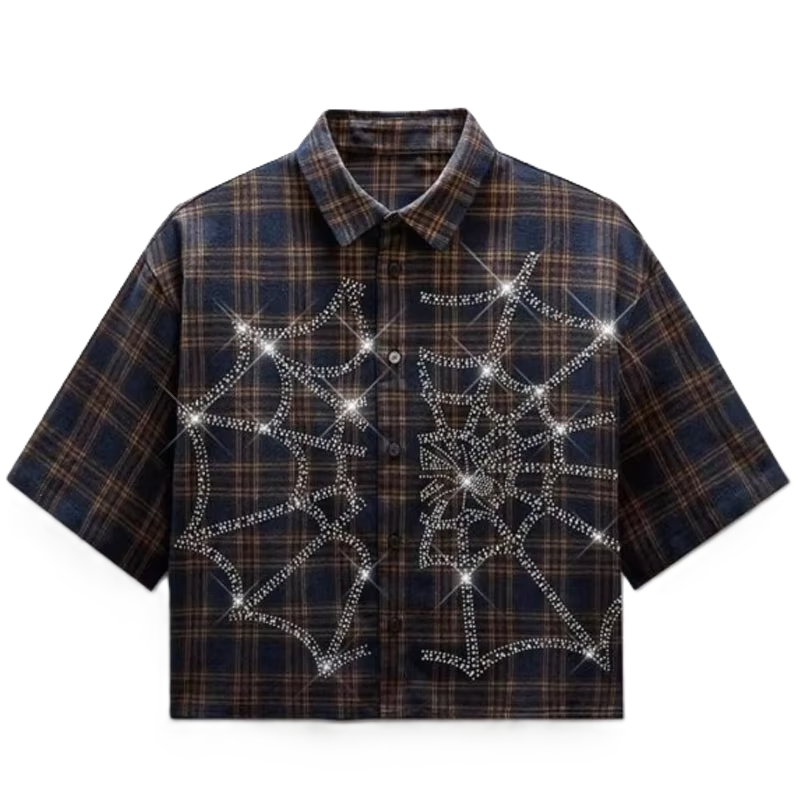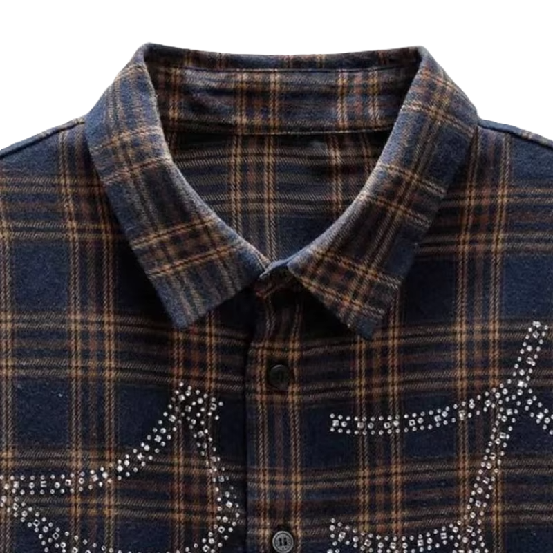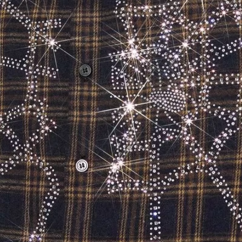 Camisa de Franela a Cuadros con Pedrería, Personalizada, Primavera/Verano, Estilo Vintage, Transpirable, Suave al Tacto, Corte Holgado, Manga Corta, 100% Algodón