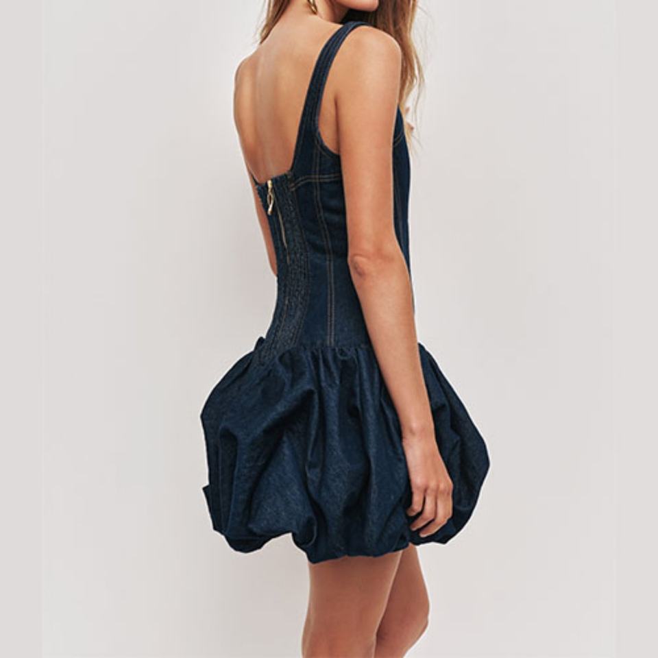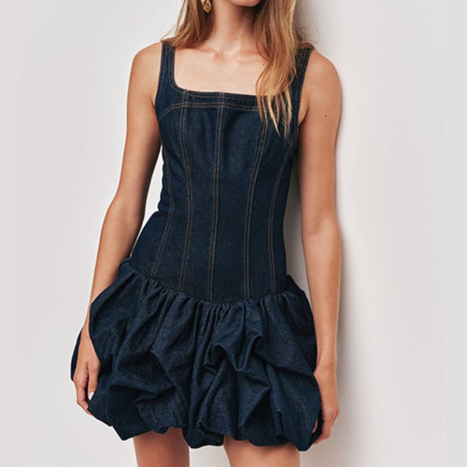 Vestido vaquero mini para mujer con cuello cuadrado personalizado, tirantes, corte acampanado, cremallera metálica y sin mangas de algodón