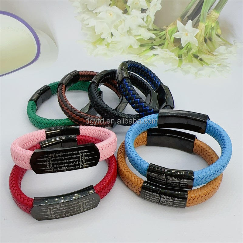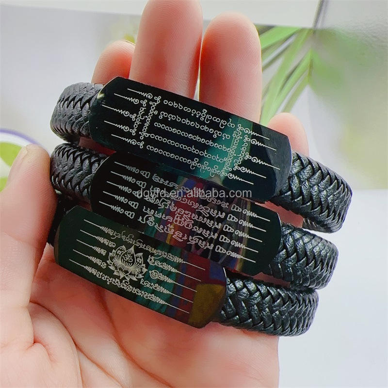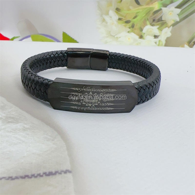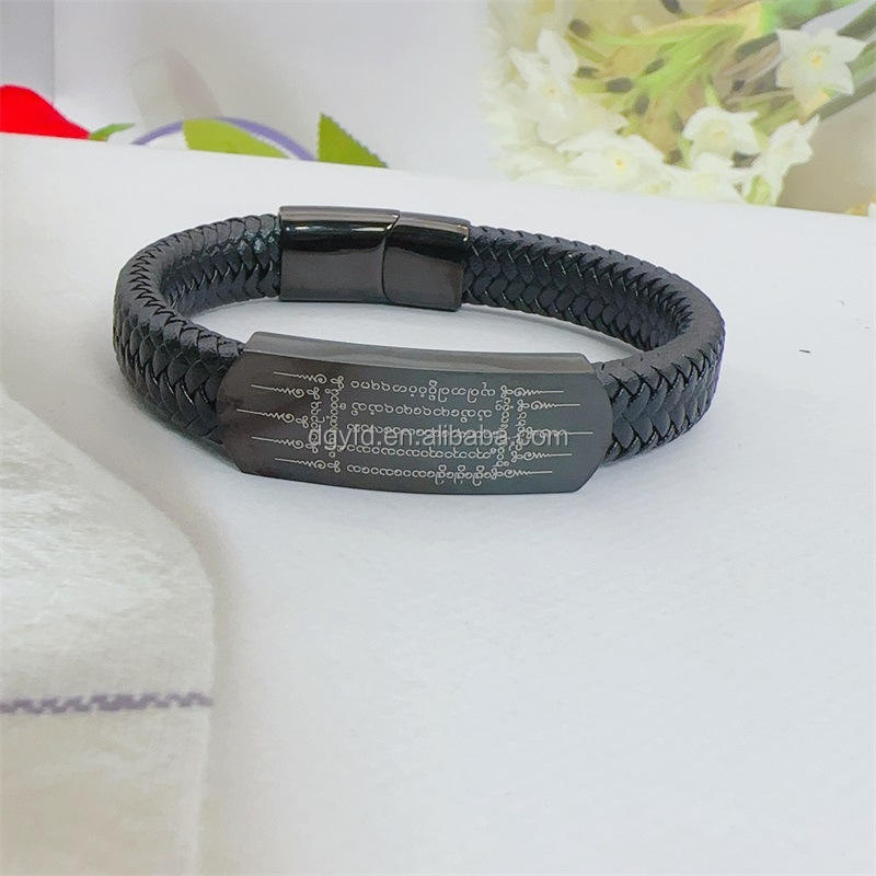 Acero inoxidable personalizado grabado libro canción lírica hebreo Mantra Biblia cita escritura verso pulseras de cuero para hombres