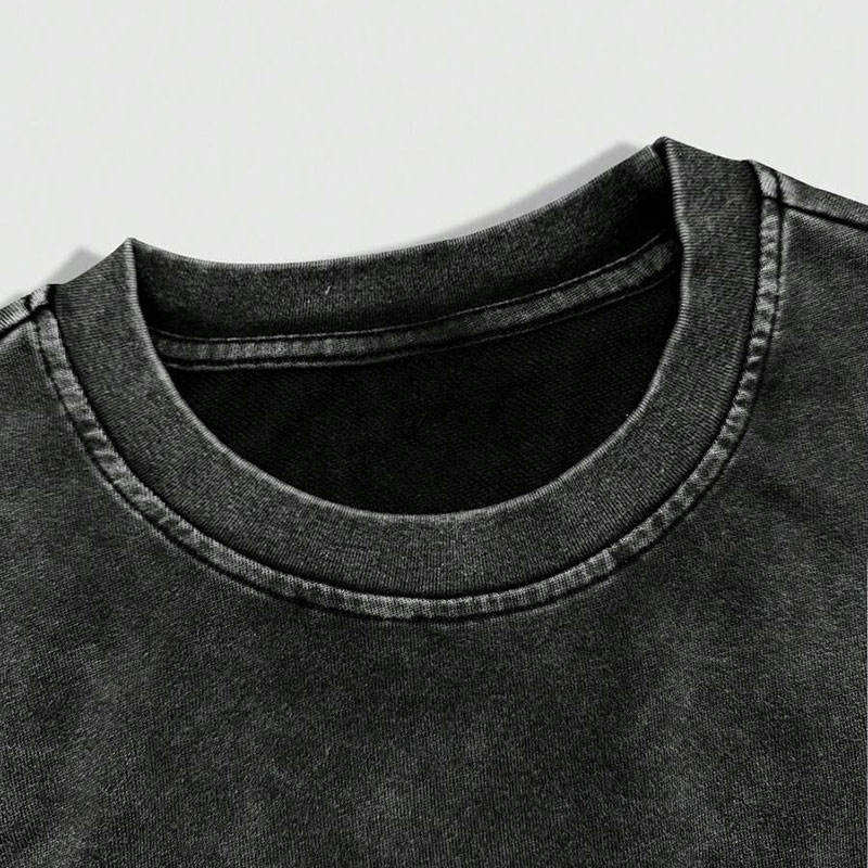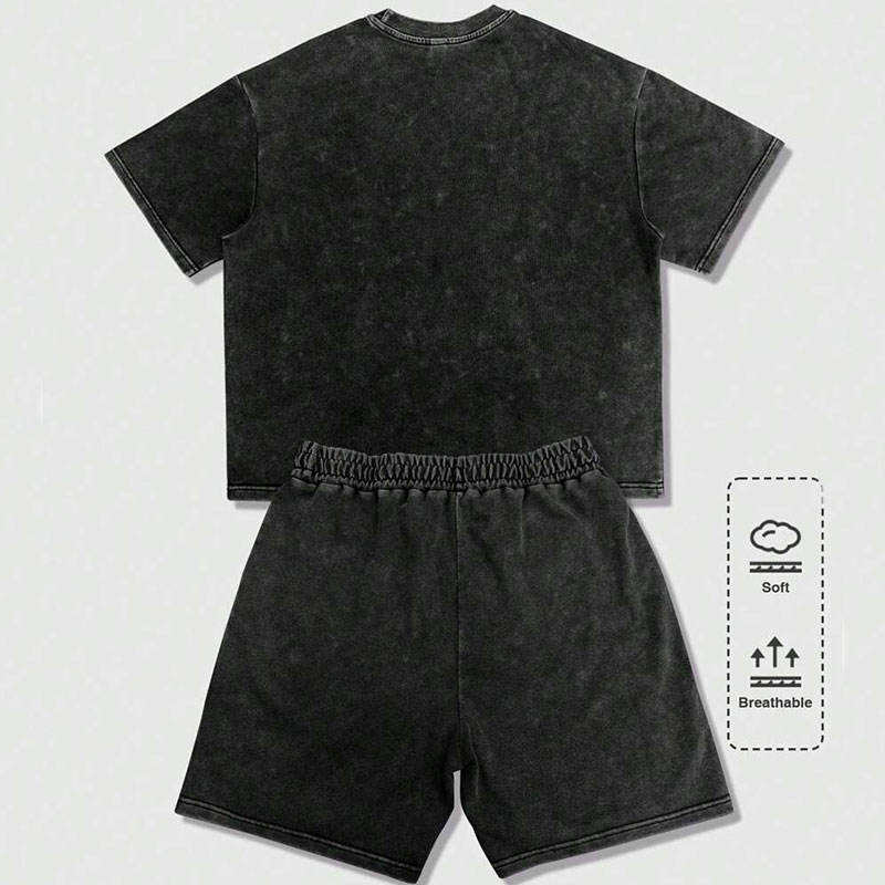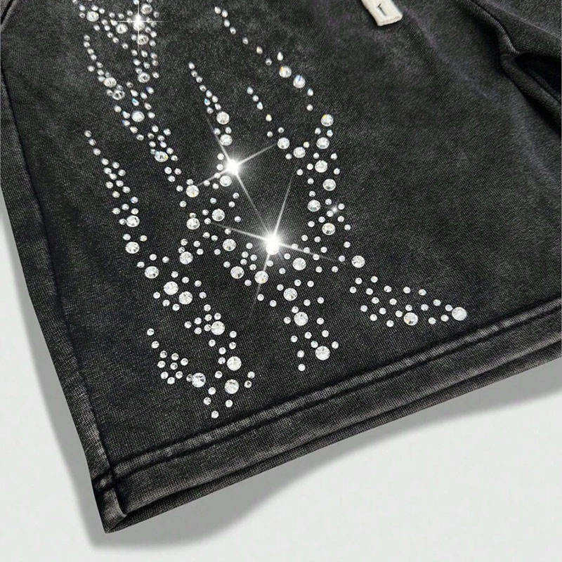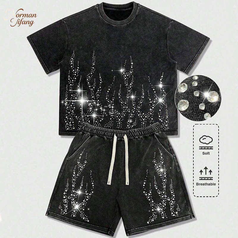 Conjunto de Dos Piezas Personalizado Estilo Urbano con Pedrería, Camiseta de Manga Corta Holgada con Efecto Desgastado Vintage y Pantalones Cortos