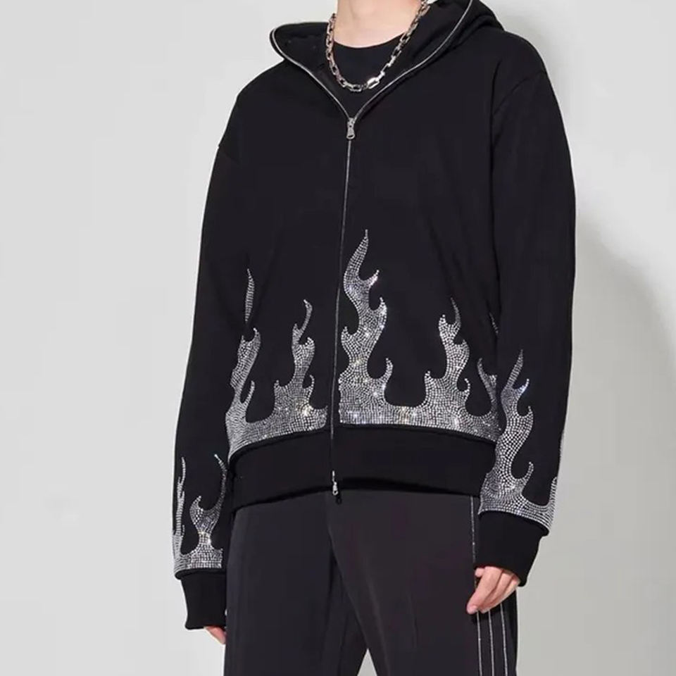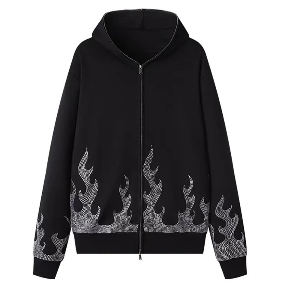 Ropa de calle personalizada de gran tamaño para hombre, Sudadera con capucha y cremallera de cara completa con diamantes de imitación, sudadera con cremallera de cara completa francesa de algodón