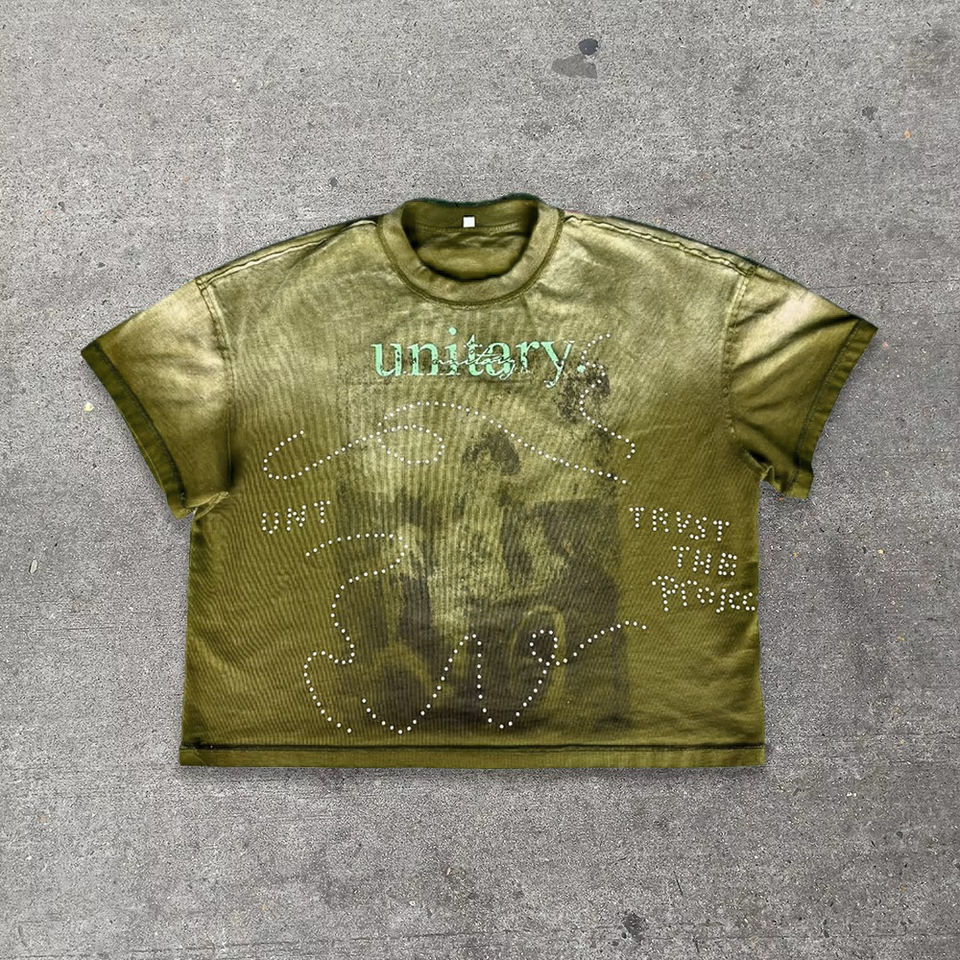 Camiseta Oversize de Algodón 100% para Hombre, Estilo Urbano Formal Personalizado, 250 GSM, con Pedrería, Lavado Ácido Desgastado, Efecto Vintage