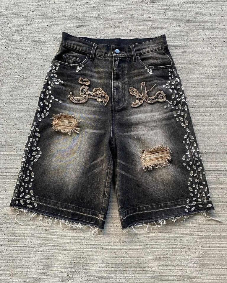 Pantalones Cortos de Mezclilla Casuales para Hombre con Borde Deshilachado, Estilo Streetwear Personalizado, con Pedrería de Cristal y Lavado Ácido