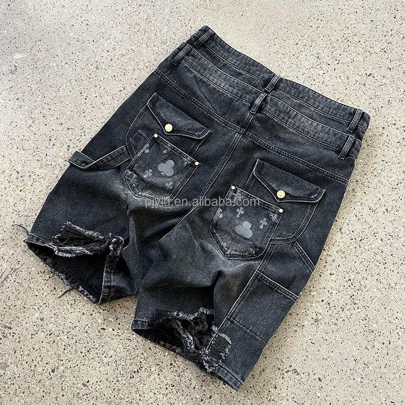 Ropa de calle personalizada Pantalones cortos de mezclilla desgastados con borlas rasgadas de cintura doble para hombre Pantalones cortos de mezclilla desgastados con pierna recta