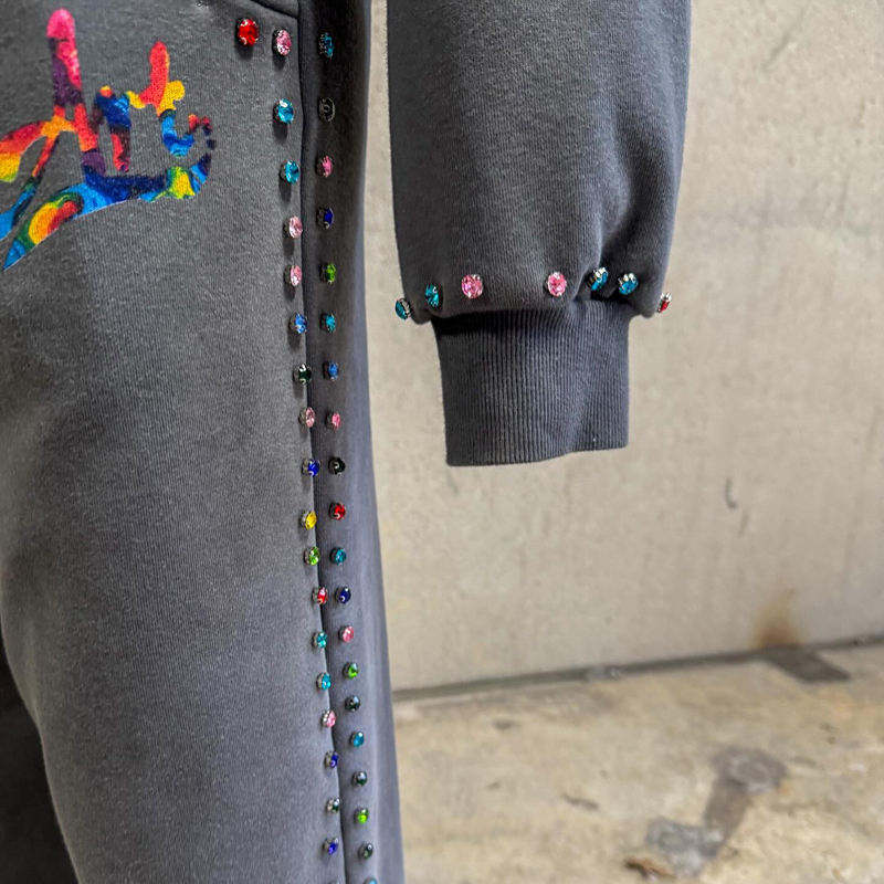 Conjunto de Sudadera con Capucha y Pantalones Deportivos de Felpa Francesa con Estampado de Diamantes de Imitación, Lavado Ácido y Efecto Desgastado, Estilo Urbano Personalizado