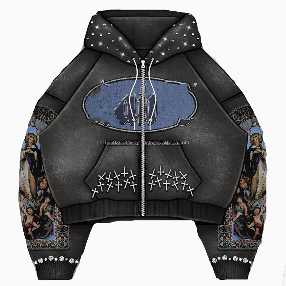 Sudadera con Capucha de Algodón 100% para Hombre, Estilo Urbano Personalizado, con Pedrería, Estampado Serigrafiado, Lavado Desgastado, Dobladillo sin Rematar, Talla Grande, Estilo Vintage, Lavado Ácido, para Otoño