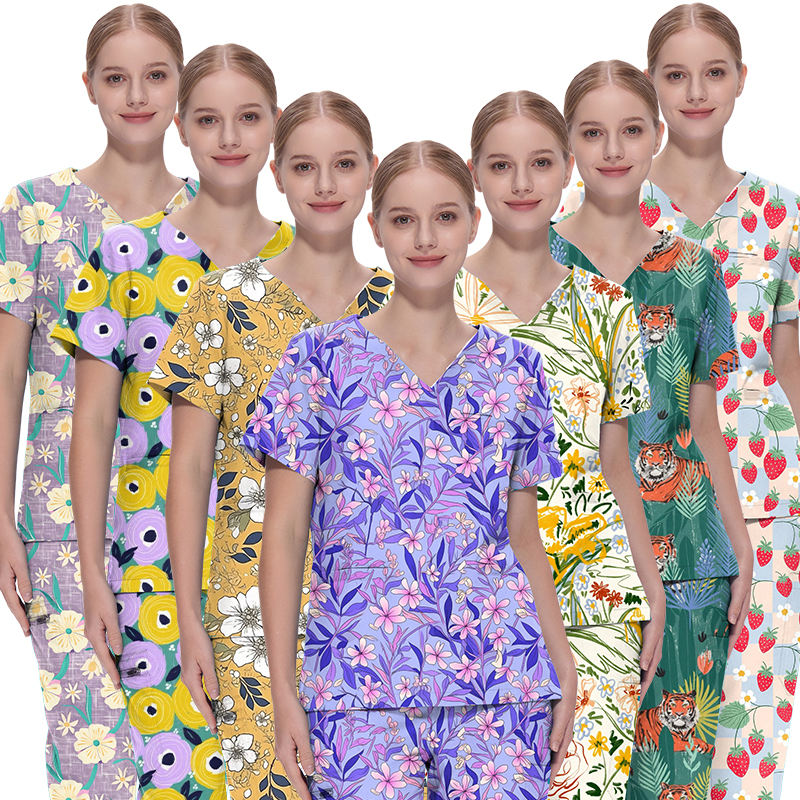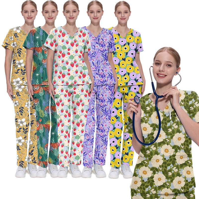 Personalizado elástico médico impreso Scrub uniforme de dibujos animados lindo impreso quirúrgico Scrub médico Scrub elástico impreso conjunto