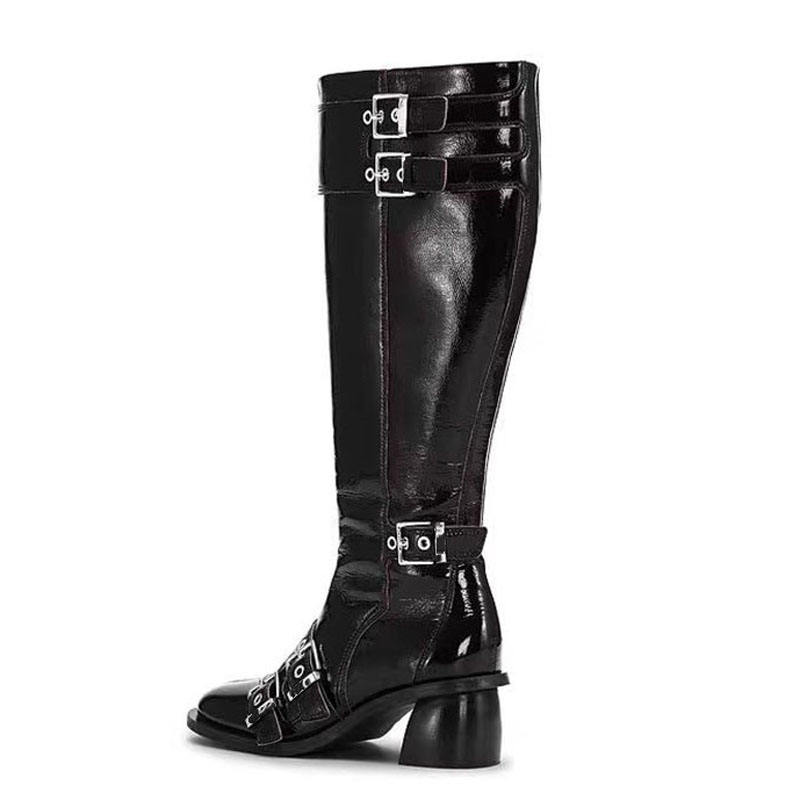 Botas de tacón bajo grueso estilo personalizado con cinturón y hebillas metálicas para mujer, botas vaqueras de punta cuadrada hasta la rodilla, botines largos de punta cuadrada