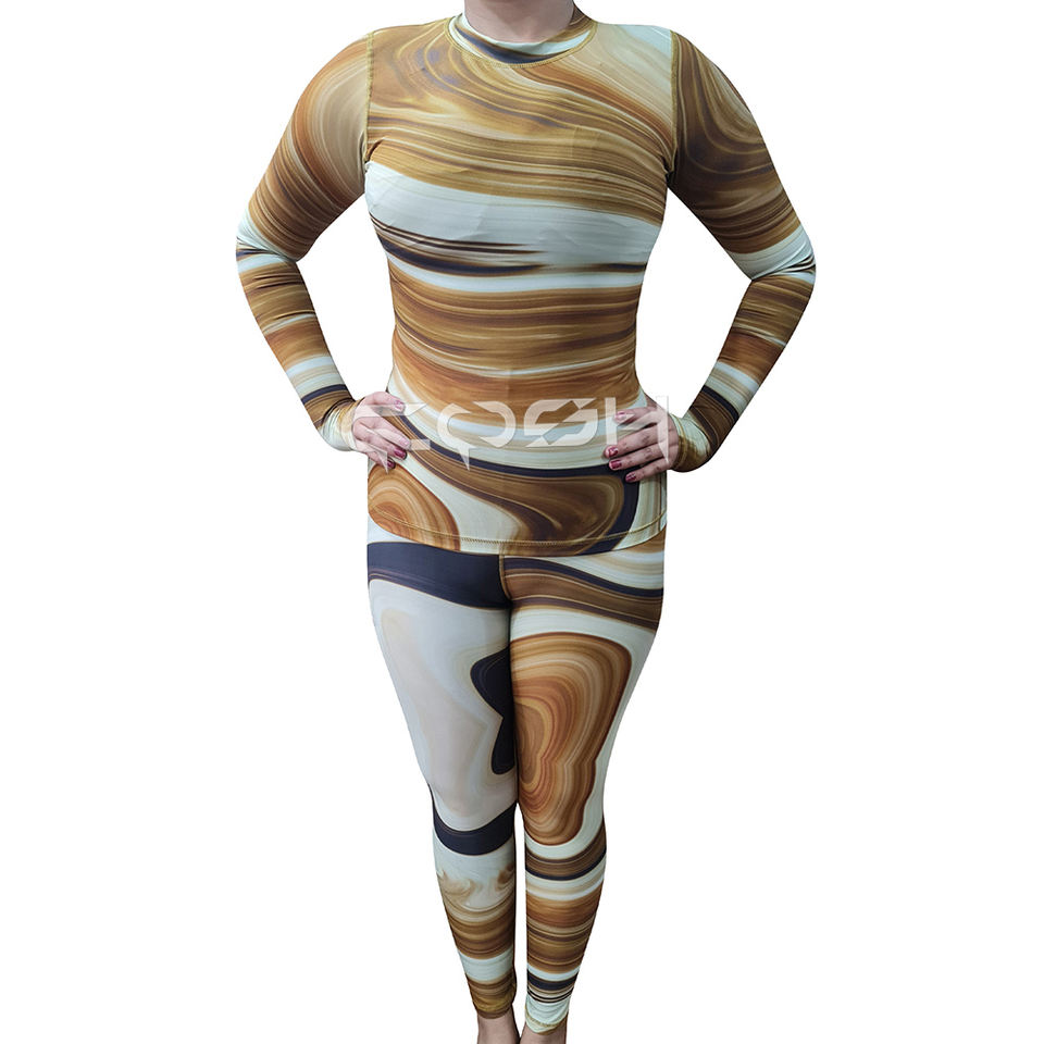Conjunto Deportivo de Compresión para Mujer con Estampado de Mármol Sublimado Personalizado, Top de Manga Larga y Leggings, Fabricante de Ropa Deportiva