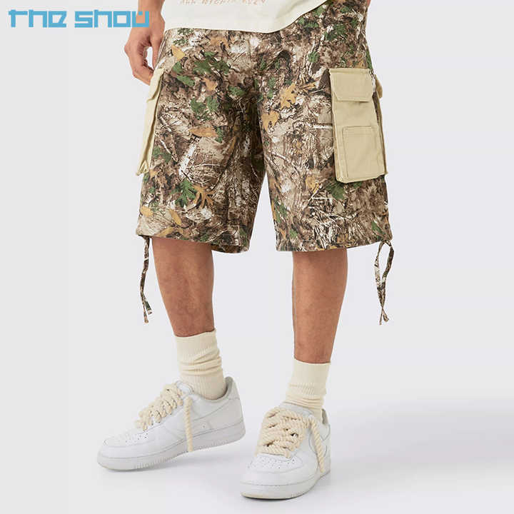 Pantalones Cortos Cargo de Trabajo para Hombre, Estampado Digital Real Tree, Paneles en Contraste, Camuflaje Bosque, Estilo Holgado de Verano, Tela Twill