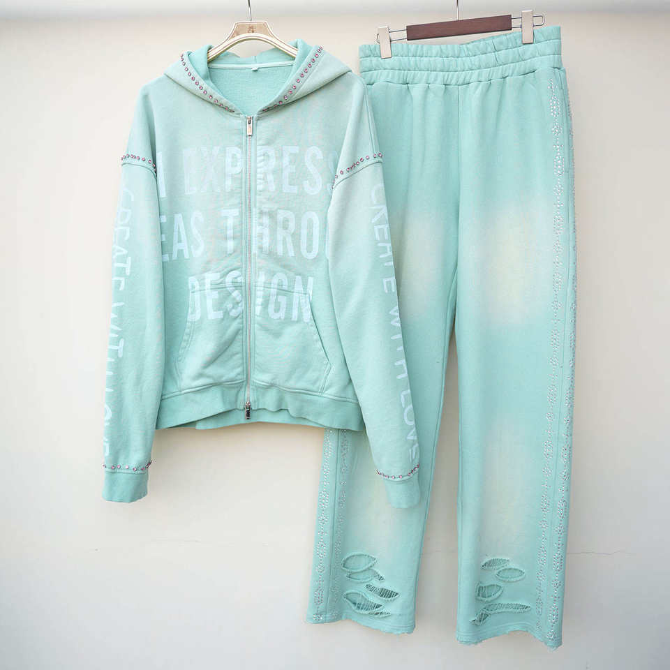 Chándal personalizado con cremallera lavada y desteñida al sol para hombre, chándal con estampado de diamantes de imitación, sudaderas con capucha, pantalones de chándal para hombre desgastados