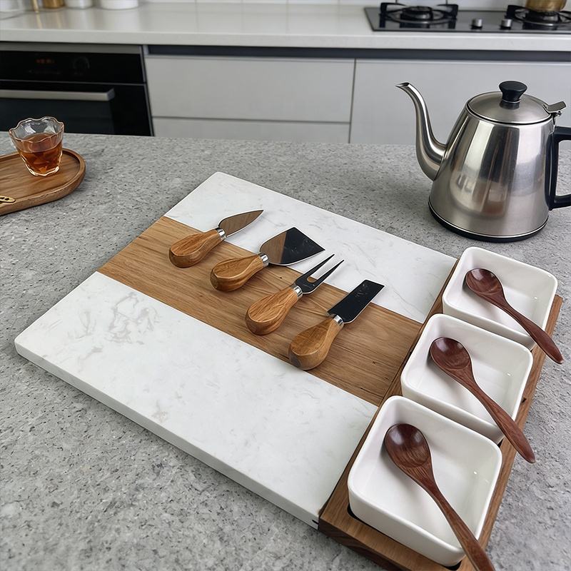 Tabla de Quesos Rectangular Personalizada y Sostenible de Mármol y Madera de Acacia con 3 Tazones de Cerámica