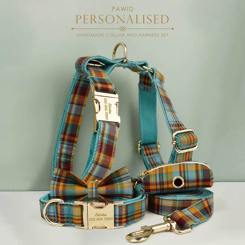Collar personalizado sólido personalizado, correa de pajarita a juego, arnés romano, Combo diferente, Collar de perro Azul, nailon acolchado