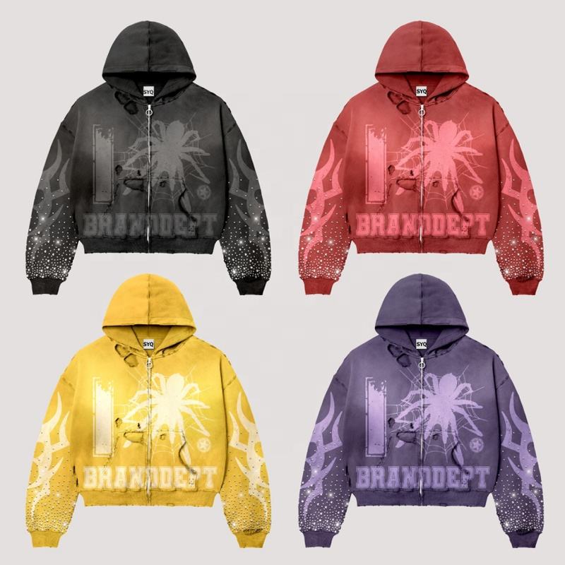 Sudadera con Capucha Personalizada de Alta Calidad con Estampado Completo de Grafiti, Sudadera Vintage Lavada y Desgastada con Cierre para Hombre