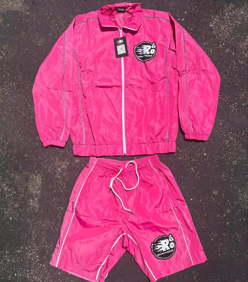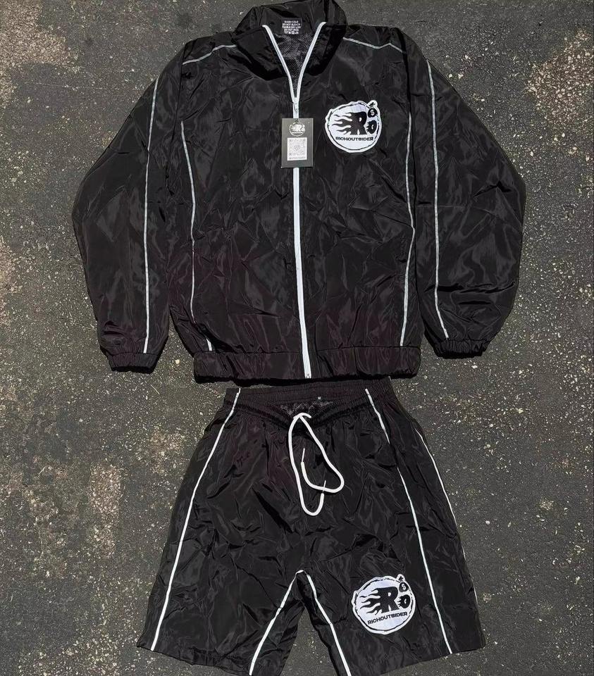Conjunto de Chaqueta Corta y Pantalones Cortos de Dos Piezas Personalizado, Estilo Windbreaker, con Parches, Cierre de Cremallera, Nailon y Poliéster, Ropa Deportiva Urbana para Hombre