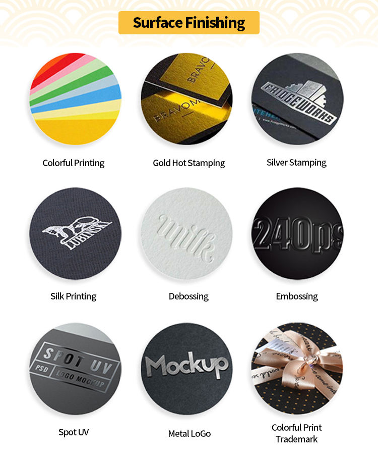 Laminación mate, Barnizado, Estampado, Relieve, Laminación brillante, Revestimiento UV, Desaparición, Lámina de oro