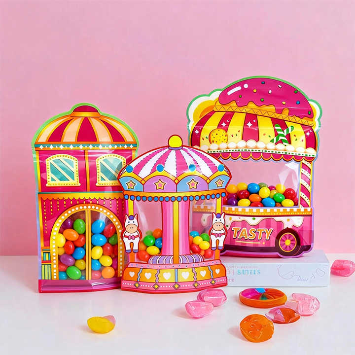 Bolsas de embalaje de alimentos con forma personalizada, bolsas de embalaje con cierre y ventana para dulces, cortadas a troquel.