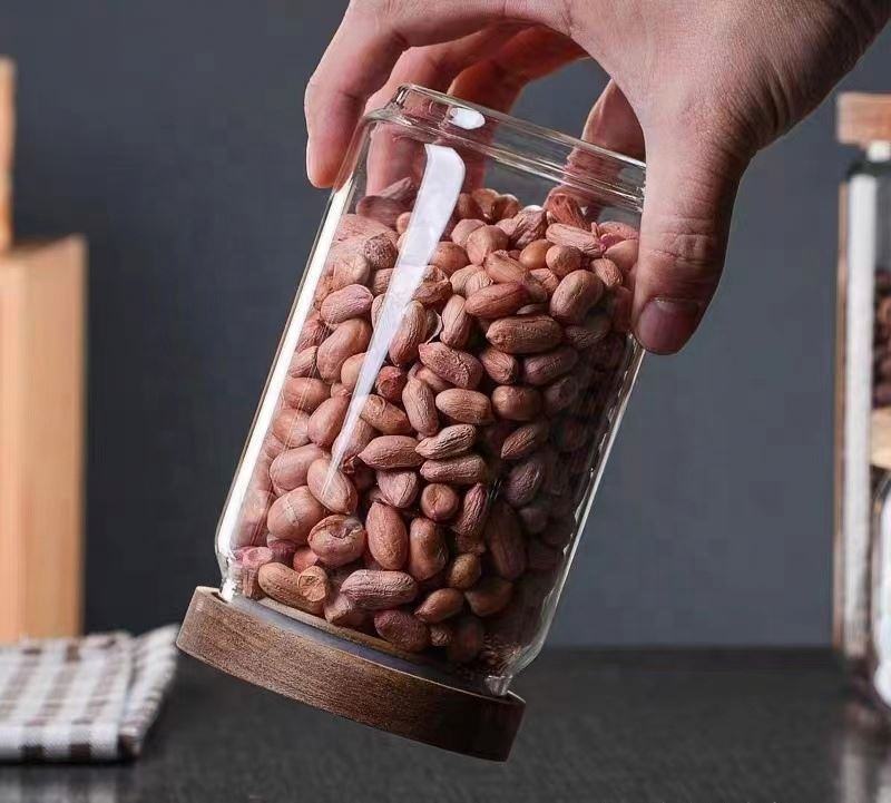Nombre del producto:Tarro de Almacenamiento de Vidrio Personalizado en Varios Tamaños con Tapa de Madera de Acacia