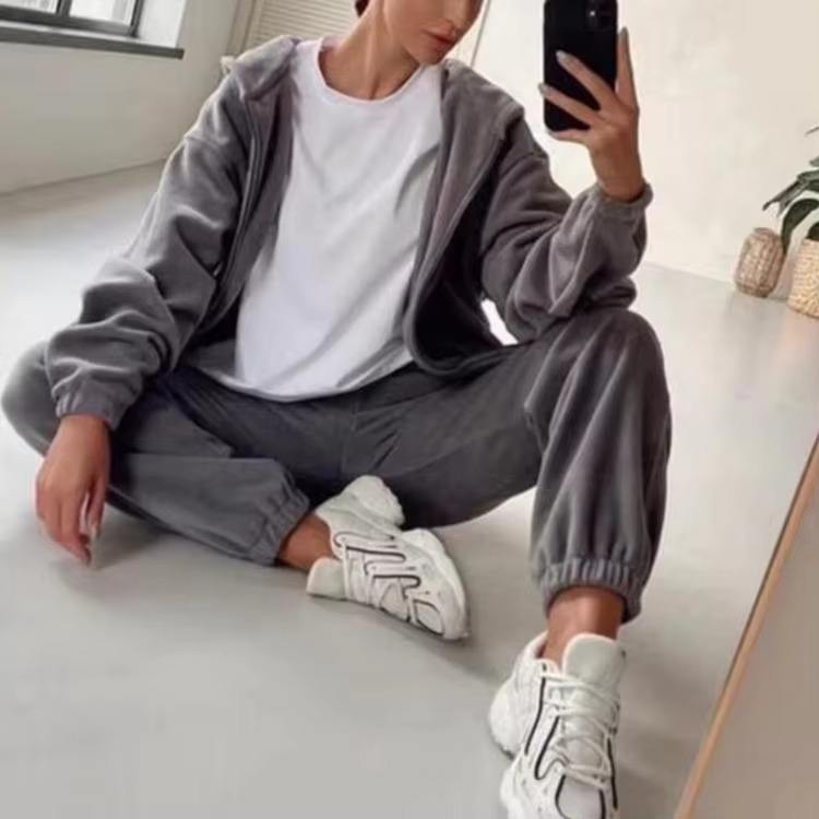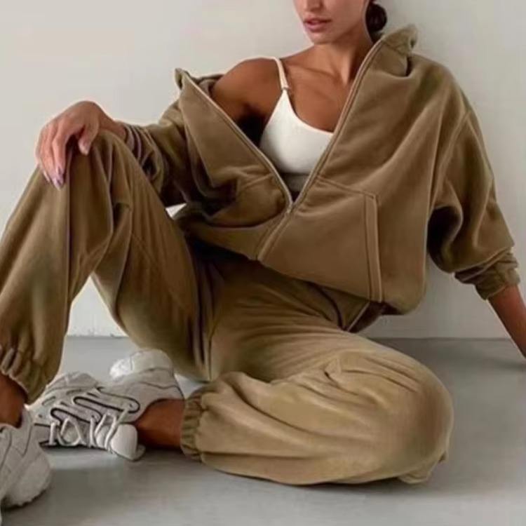 Conjunto de chándal de invierno de terciopelo personalizado de dos piezas para mujer: sudadera corta con cremallera y pantalones de pierna ancha, ligero, al por mayor, para chicas altas.