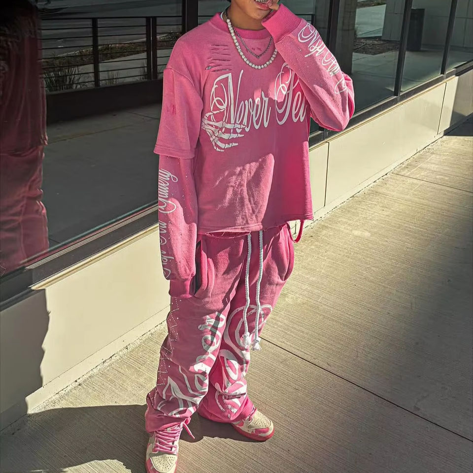 Conjunto de sudadera y Jogger de manga larga de doble capa con serigrafía cuadrada de algodón vintage personalizado
