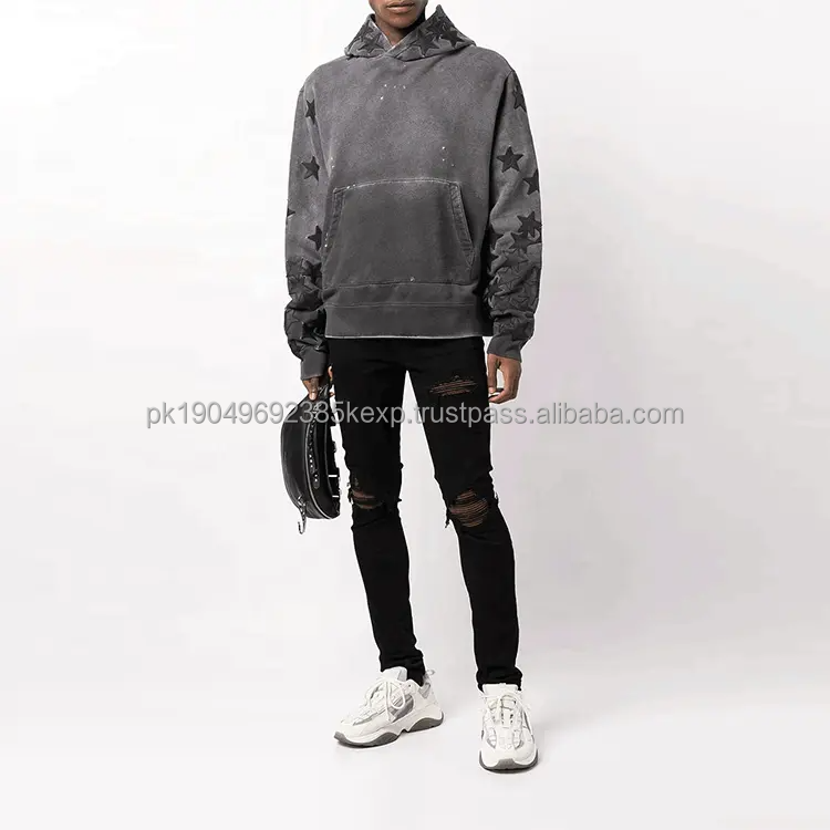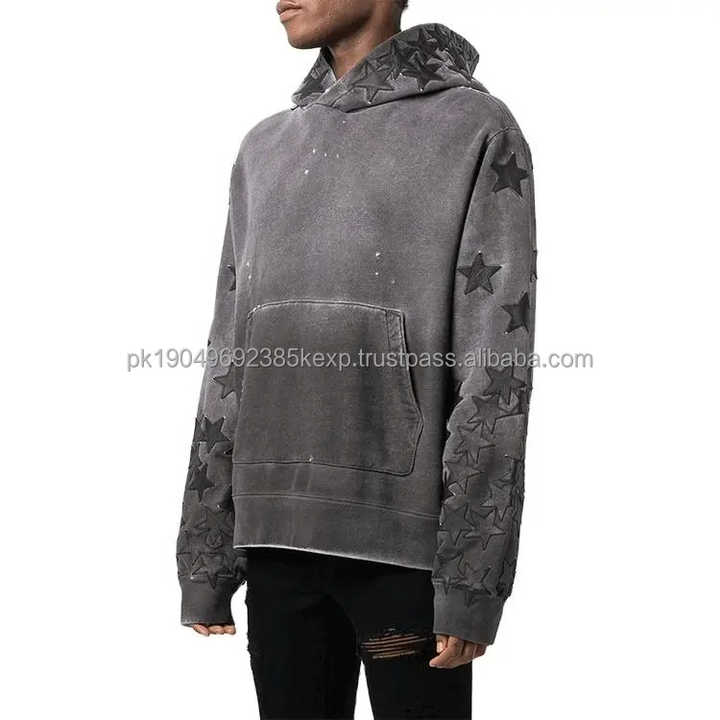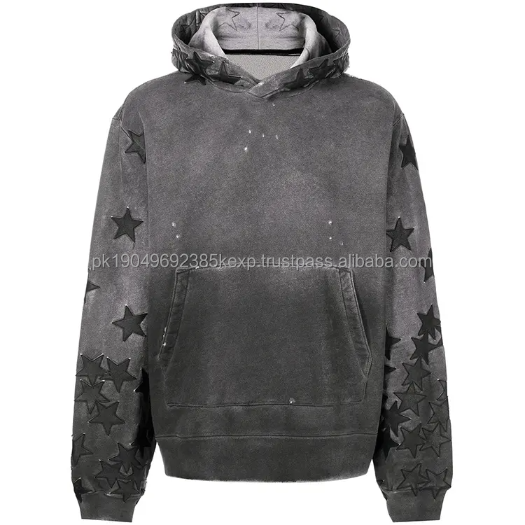 Sudadera con capucha lavada con ácido y parche de estrella bordada desgastada de 400GSM de peso alto estilo callejero Unisex Vintage personalizada