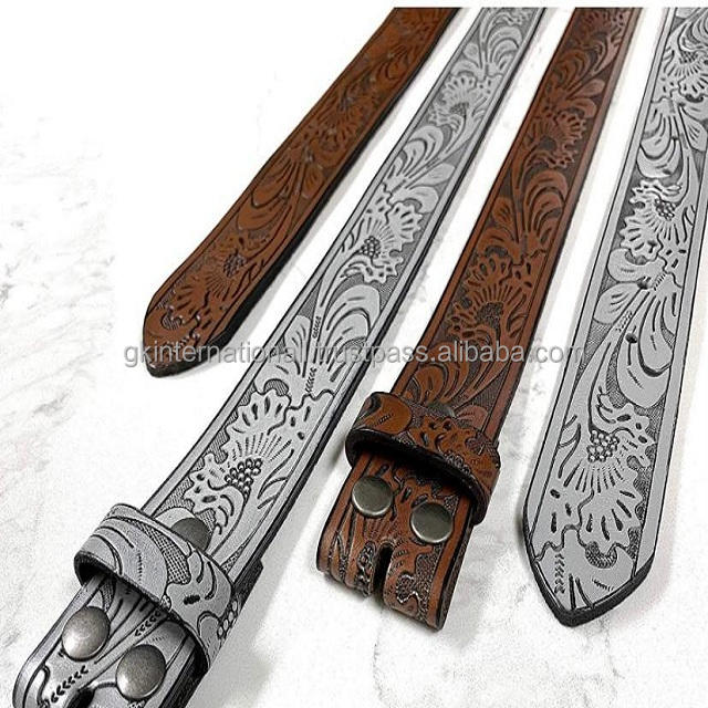Cinturón occidental de cuero de una capa de grano completo, hebilla cromada de latón sólido, fuerte y duradero con diseño floral