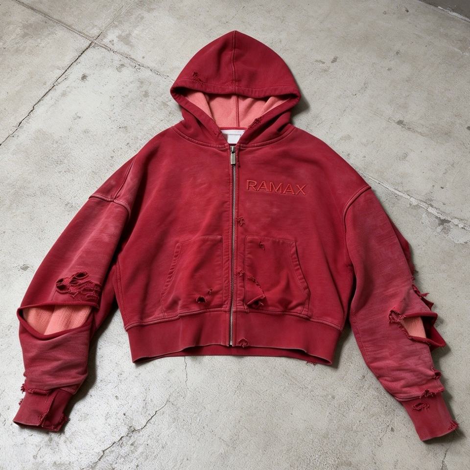 Sudadera con capucha de invierno personalizada de punto gofrado de doble capa 100% algodón con cremallera, corte holgado, efecto desgastado, apliques bordados y lavado ácido