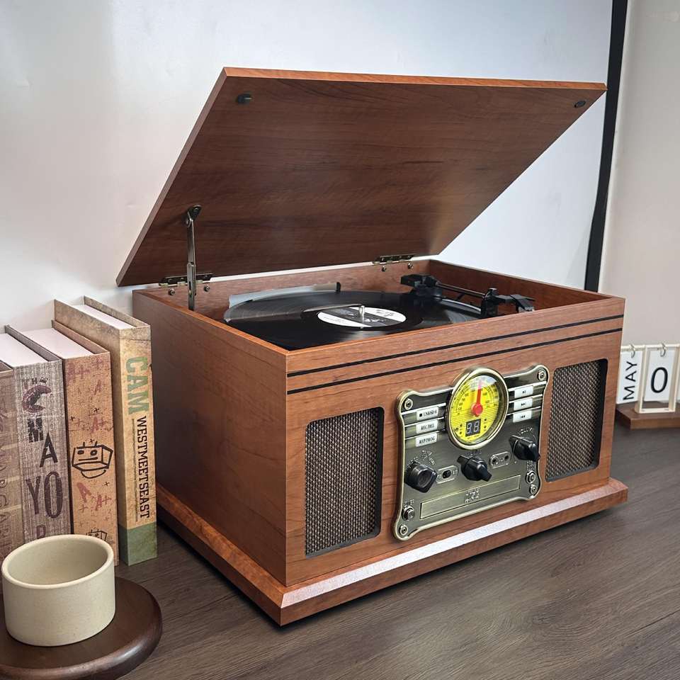 Gramófono de Madera de Nogal Personalizado de 3 Velocidades con Bluetooth, FM, CD y Altavoz Integrado, Reproductor de Vinilos Multifuncional con Audio de Alta Fidelidad