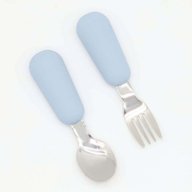 Juego de tenedor de cuchara de silicona de grado alimenticio personalizado al por mayor para bebés, tenedor de cuchara de acero inoxidable, tenedor para niños, entrenamiento de alimentación