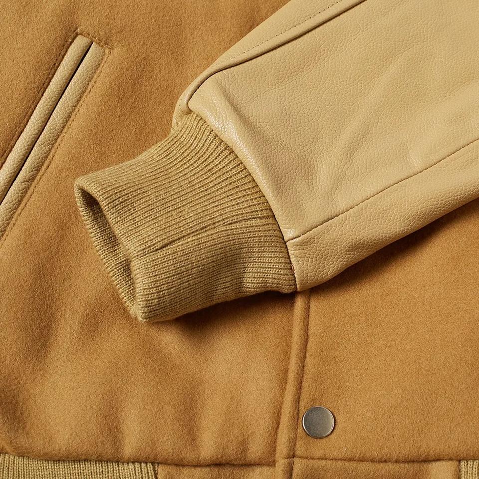 Ropa de calle de invierno personalizada para hombre, chaqueta bomber universitaria de lana con botones bordados de chenilla, chaqueta universitaria con mangas de cuero para hombre