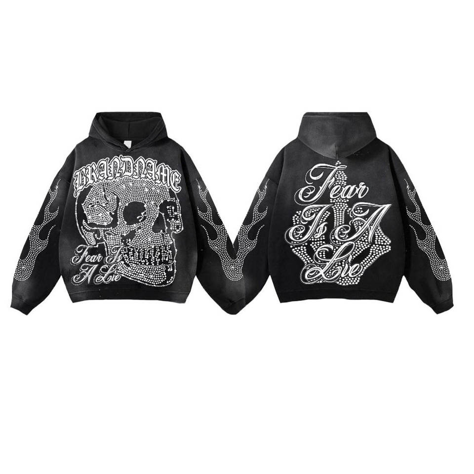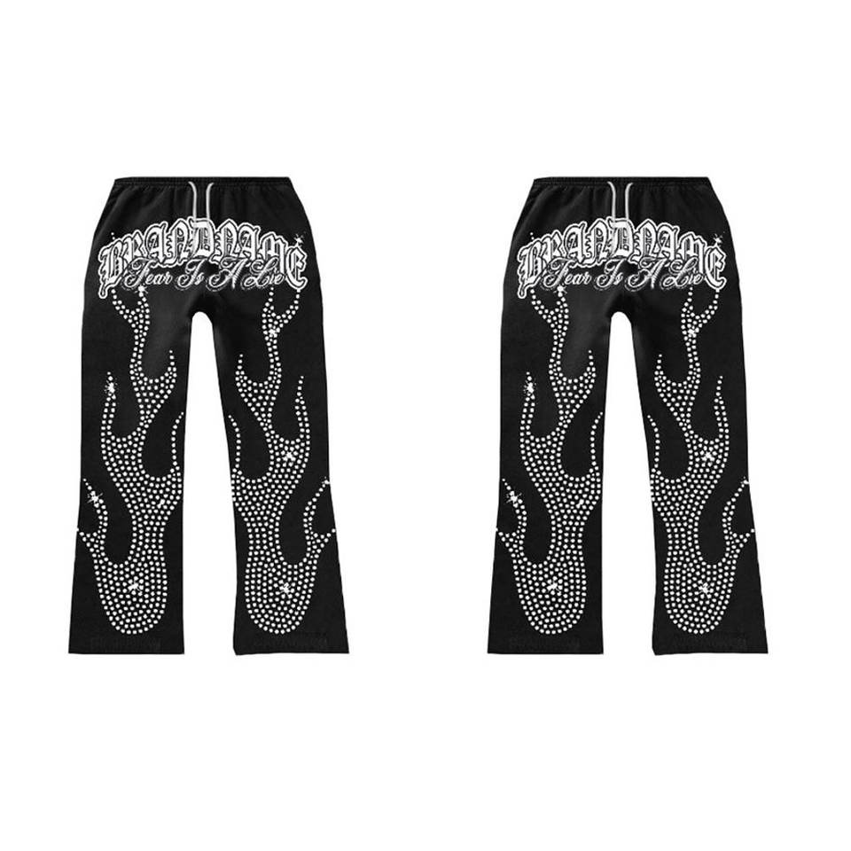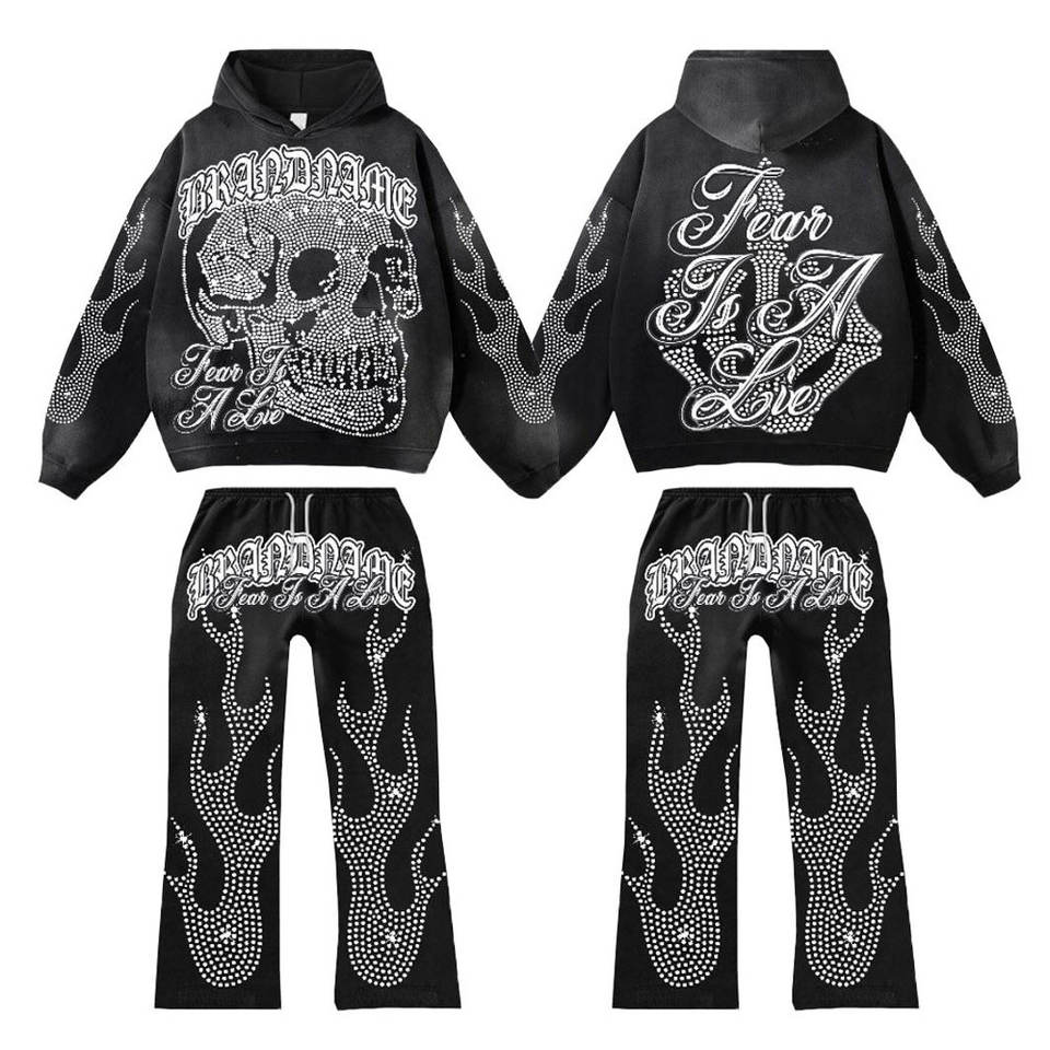 Chándal de invierno personalizado con estampado de ropa urbana, pedrería sólida, bordado desgastado y pantalones de chándal con parche de piedra efecto descolorido por el sol
