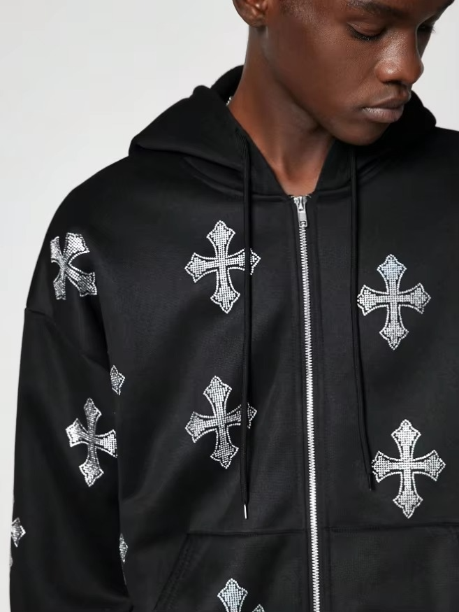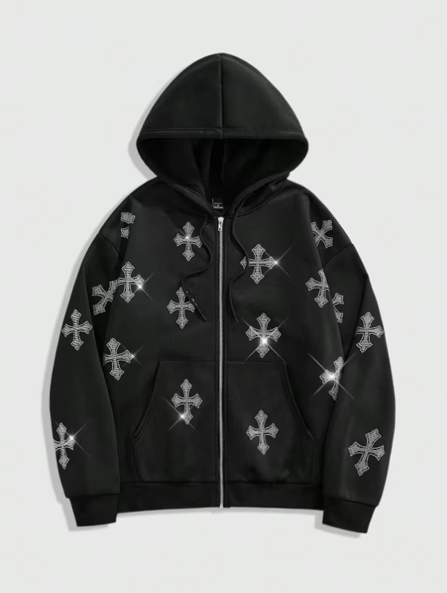 Sudadera con capucha personalizada para mujer, estilo gótico, con cruz de diamantes de imitación, cierre de cremallera, 350GSM, algodón grueso, forro polar, con cristales brillantes, estilo urbano.